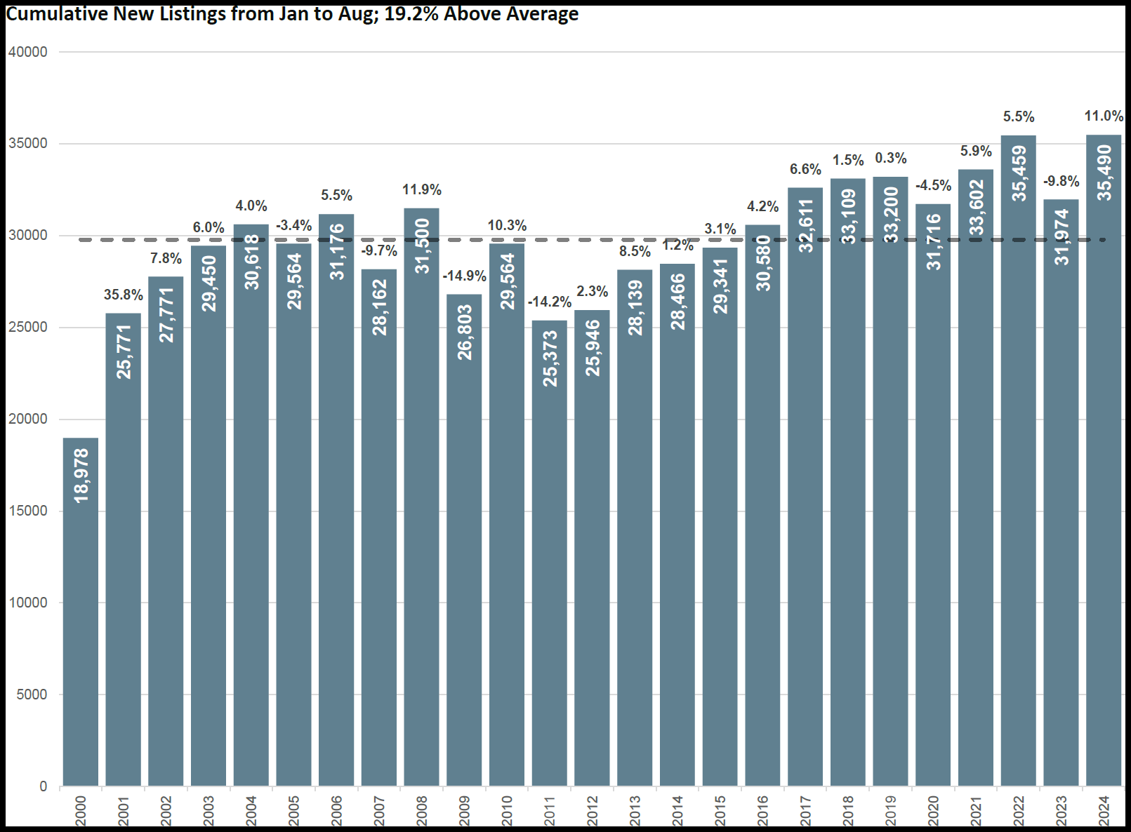 In 2022 and 2023, the seasonal pattern continued with strong spring and summer activity. However, 2024 has been particularly notable, with a 19.2% increase in cumulative new listings from January through August compared to the historical average. The spring and summer months of 2024 have been exceptionally active, with new listings consistently outpacing those of previous years.