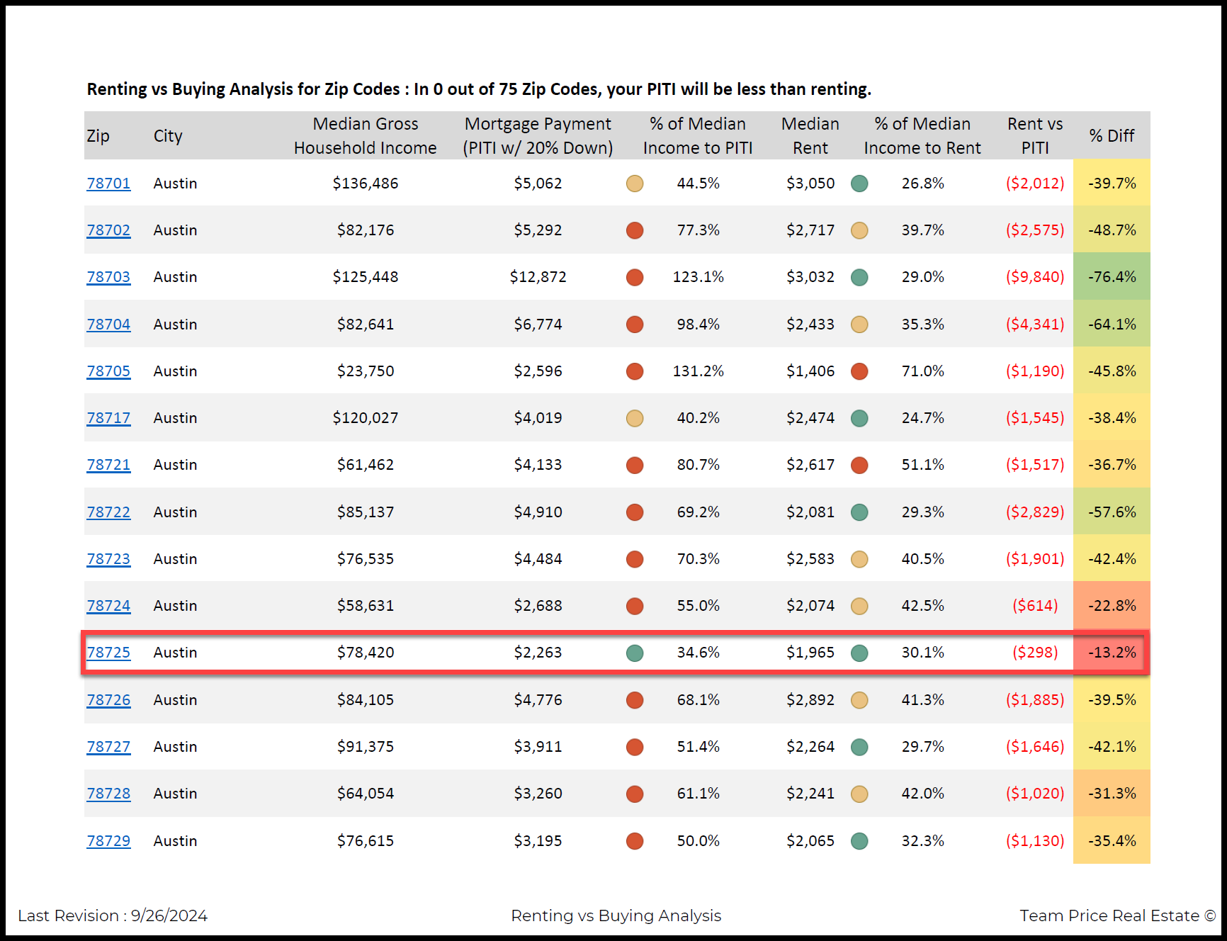 The housing market in Austin’s 78725 zip code presents an intriguing balance between renting and buying, particularly for prospective homeowners and renters evaluating their long-term options. As of September 2024, the data suggests that the gap between renting and buying in this area is relatively narrow, making it a prime location for careful financial consideration.