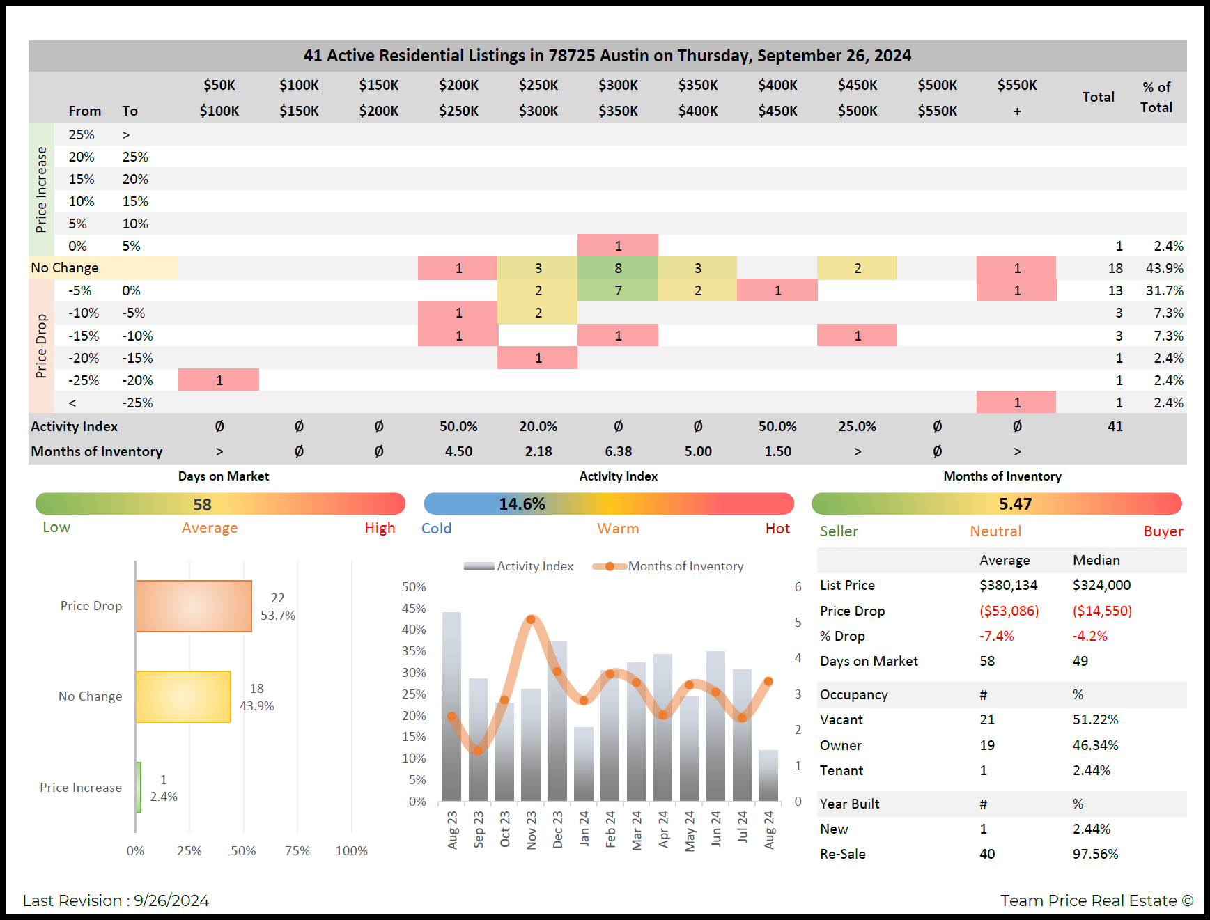 Market activity in 78725 can be characterized as balanced but slightly leaning toward buyers. The months of inventory currently stand at 5.47 months, reflecting a market in transition. A market with 4 to 6 months of inventory is generally considered balanced, meaning that supply and demand are roughly in equilibrium. However, the fact that more than half of the homes have undergone price cuts suggests that buyers may have greater negotiating power, especially for homes that have been on the market for more than 50 days.