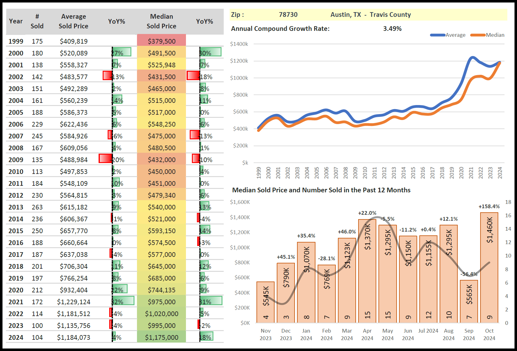 The annual compound growth rate for the 78730 zip code from 1999 to 2024 stands at 3.49%, reflecting steady and consistent long-term growth. However, what sets this area apart is the recent surge in the median sold price, making it the standout zip code in Austin for 2024. In 2023, the median sold price in 78730 was $995,000, showing a slight decline from previous highs. However, 2024 brought a strong recovery, with the median sold price jumping to $1,175,000, marking an impressive 18% increase compared to the previous year.
