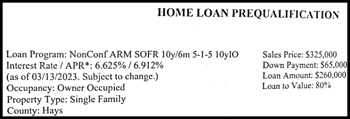 Here is an illustration of a pre-qualification for an adjustable-rate mortgage. The specific type of mortgage is a non-conforming adjustable-rate mortgage that is based on the SOFR benchmark, with a fixed interest rate for the initial 10-year period and a reset period of 6 months. The mortgage has a cap on the maximum interest rate changes, which is 5% after the initial 10 years, and a maximum lifetime interest rate change of 5%. Additionally, there is an initial interest-only payment period of 10 years. Below, you will find a detailed explanation of what these terms mean.