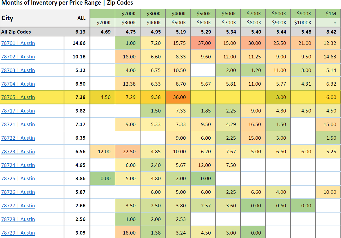 Take 78705, a ZIP code in Central Austin known for its mix of student housing, rentals, and small multifamily properties. On paper, it shows an overall inventory of 7.38 months, but that figure is just an average of extremes. In the $400,000 to $500,000 range, inventory stretches to a staggering 36 months, indicating that homes at this price point are barely moving. By contrast, homes in the $800,000 to $900,000 range show only three months of supply, a pace consistent with a seller-tilted environment. The same neighborhood is simultaneously in both buyer control and seller control, depending on price point.