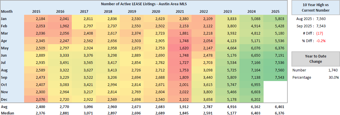 Are rent prices dropping in Austin? The data says yes. Rents have slipped from their 2023 peak while rental inventory has surged to record levels, creating the most renter-friendly conditions Austin has seen in years. This September, Austin recorded 7,543 active residential lease listings. That’s up from 7,138 in September 2024 and 5,809 in September 2023, marking the largest September inventory ever in the Austin housing market.