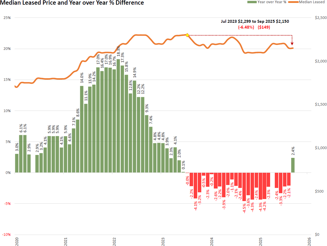 Yes. Median rents peaked at $2,299 in July 2023 but have since fallen to $2,150 as of September 2025. That’s a 6.48% decrease, or $149 less per month. The combination of record-high inventory and slower absorption has created mild downward pressure on pricing.
