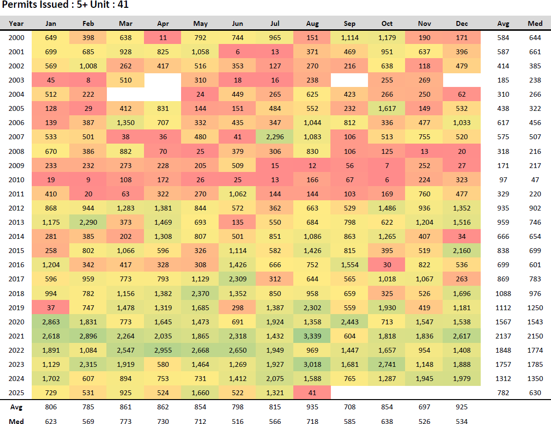 In August 2025, permits for 5+ unit buildings collapsed to just 41. That’s a 97.4% year-over-year decline and a 95.6% shortfall versus the long-term August average, signaling a sudden freeze in the multifamily pipeline. Month over month, activity plunged from 1,321 permits in July to 41 in August, a 96.9% drop. These are extreme readings that point to a reset in future multifamily supply across the Austin–Round Rock–Georgetown MSA.