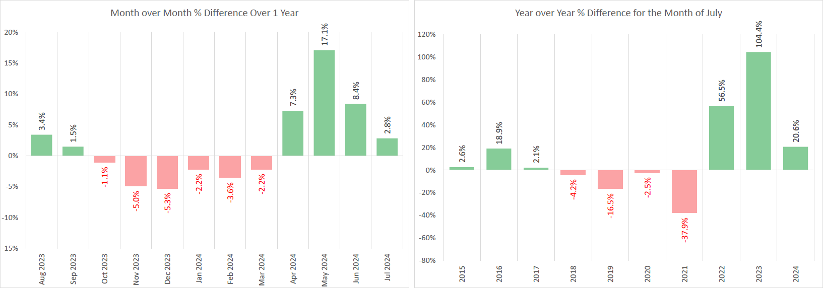 Analyzing percentage differences year-over-year highlights the fluctuations in the market. January's data, for example, shows a 31.8% increase in 2024 compared to the previous year. Similarly, February and March recorded 28.2% and 21.1% increases, respectively. These variations reflect the market's responsiveness to various external factors and the overall growth trajectory.
