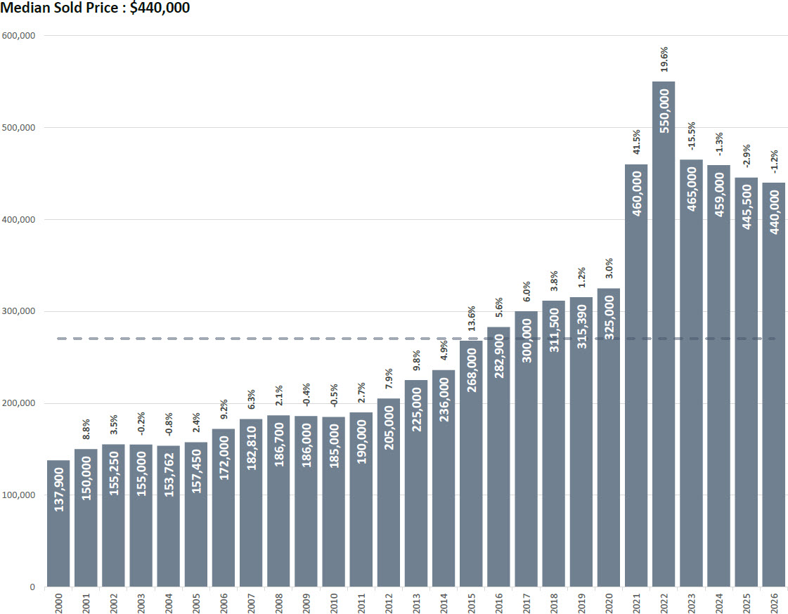 What followed the 2022 peak was swift and significant. In 2023, the median sold price fell to $465,000, a 15.5% year-over-year decline that represented the largest single-year drop in the dataset's 26-year history. The correction moderated in 2024, with prices slipping another 1.3% to $459,000, followed by a 2.9% decline to $445,500 in 2025. Now, with April 2026 running at $440,000 month-to-date, the market is tracking a fourth consecutive year of annual price declines — this time at a rate of 1.2%.