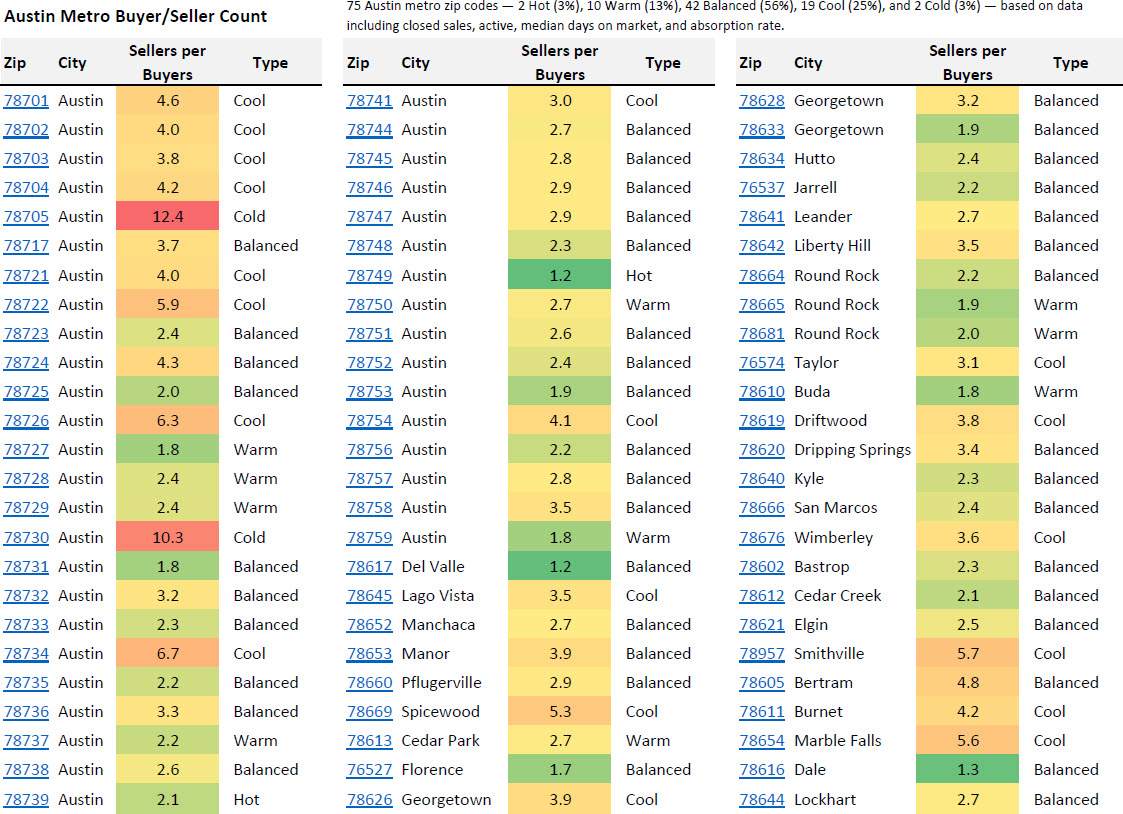 The sellers-per-buyer ratio measures how many active sellers exist for every active buyer in a given zip code. A ratio of 1.0 means equal supply and demand. Ratios below 2.0 generally indicate a competitive seller's environment, while ratios above 6.0 typically signal buyer-favorable conditions. In the current Austin real estate market, the metro-wide range runs from 1.2 in the Hot zip 78749 to 12.4 in the Cold zip 78705 — a tenfold spread that highlights how localized Austin real estate trends have become.
