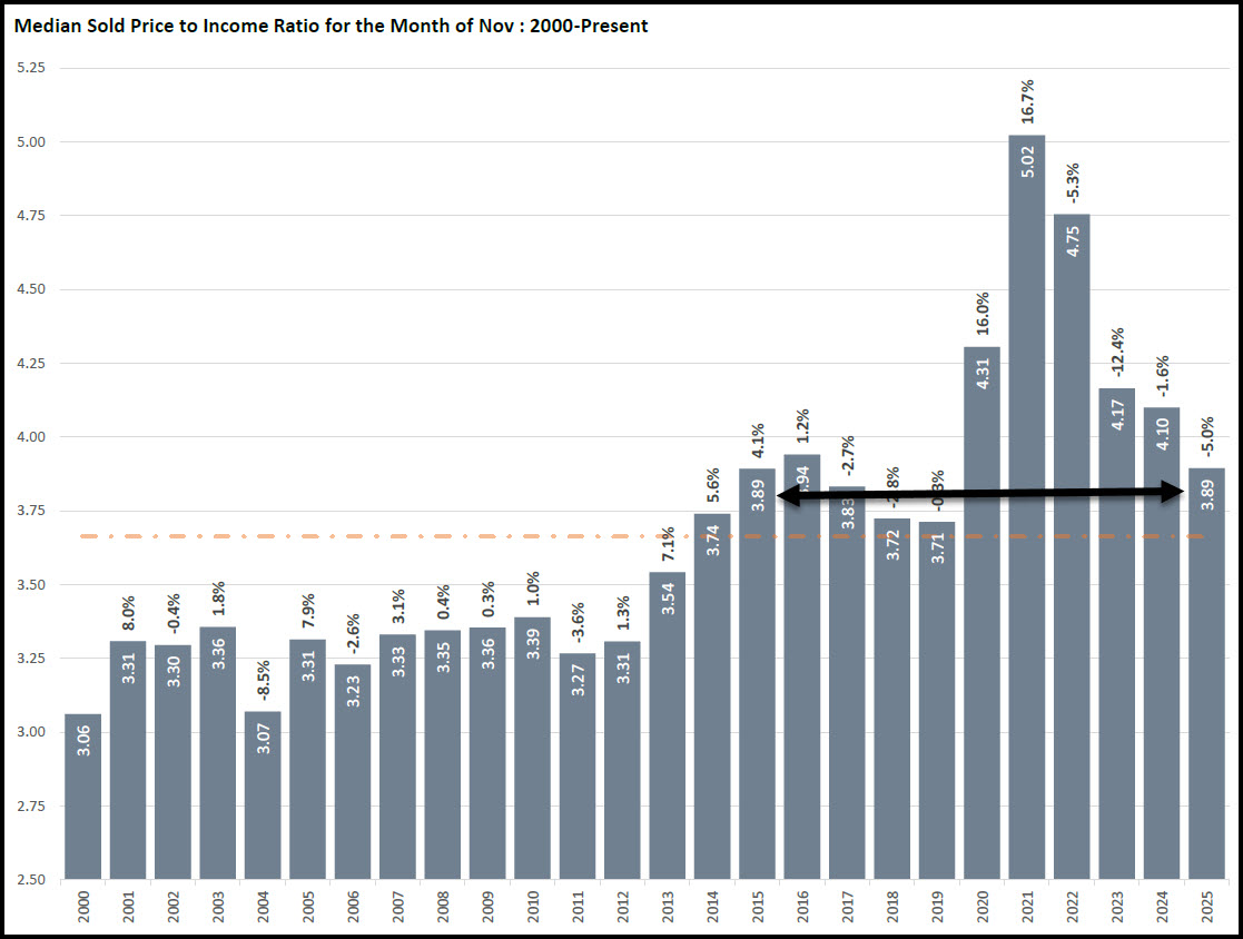 The Austin real estate market took another meaningful step toward long-term affordability this November. The Median Sold Price to Household Income Ratio landed at 3.89, a level not seen in a November reading since 2019 and identical to November 2015. That alignment matters. It signals a full reset of the affordability gains lost during the 2020–2022 surge and places Austin’s housing market much closer to its long-term historical balance. In an environment where buyers, sellers, and agents are searching for clear direction, the price-to-income ratio remains one of the most important indicators of market stability and long-term sustainability.