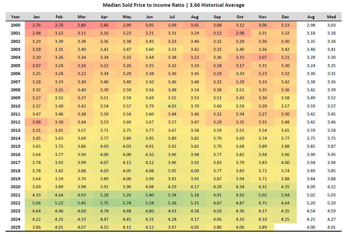Affordability improved due to price correction rather than income expansion. Elevated inventory, longer days on market, substantial price drops from the 2021–2022 peak, and increased negotiating leverage all contributed to the shift. These factors collectively reduced the median sold price enough to bring the price-to-income ratio back toward its historical balance.