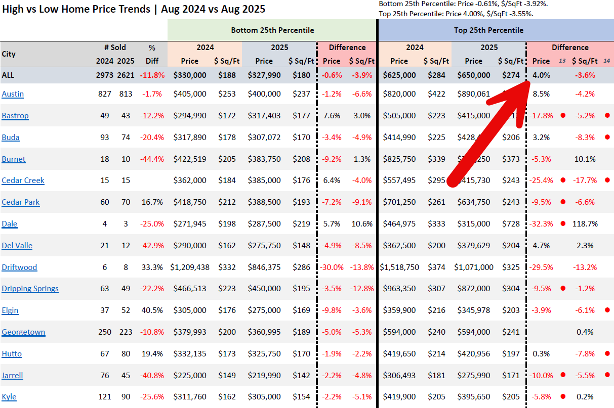 In Austin proper, the top 25th percentile price rose from $820,000 in August 2024 to $890,061 in August 2025 — an 8.5% increase. However, the average price per square foot for this group fell from $422 to $404, a 4.2% drop. This is a classic “mix shift” effect: total prices climb because larger homes make up more of the luxury transactions, but price per square foot softens because square footage is rising faster than price.