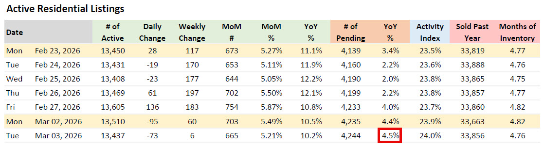 The 4.5% year-over-year increase in pending sales — bringing the total to 4,244 as of March 3, 2026 — reflects a combination of factors shaping the Austin real estate market. New listing inventory has been running below last year's pace, concentrating buyer activity among a smaller pool of available homes. At the same time, buyers appear to be engaging with the market more decisively, possibly motivated by concerns about affordability worsening further if rates or prices move higher. This is the largest year-over-year pending gain recorded since August 28, 2025, making it the most significant positive demand signal in the Austin housing market report in months.