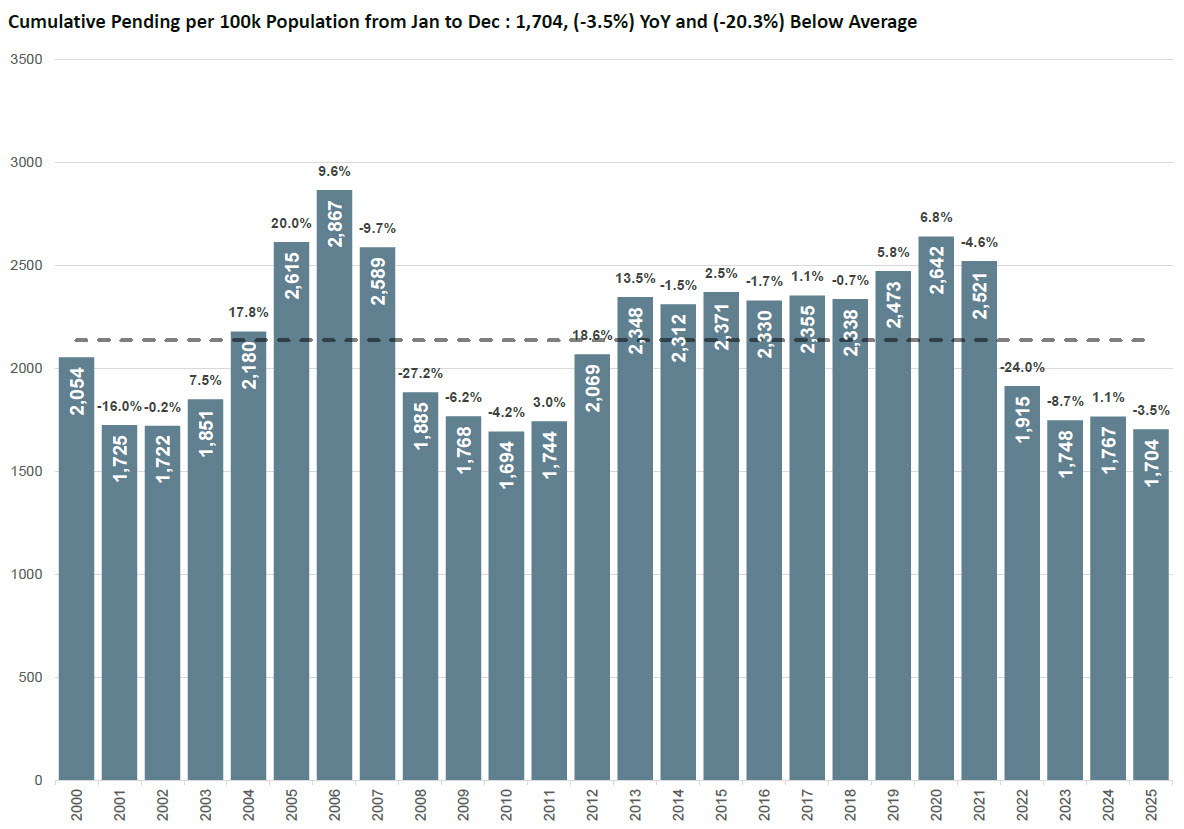 The 2025 market recorded the second-lowest per-capita pending sales level in 25 years, with only 2010 coming in lower. While the causes differ, the resulting buyer participation rate is similar. This highlights how affordability and financing conditions can suppress demand even without widespread economic distress.
