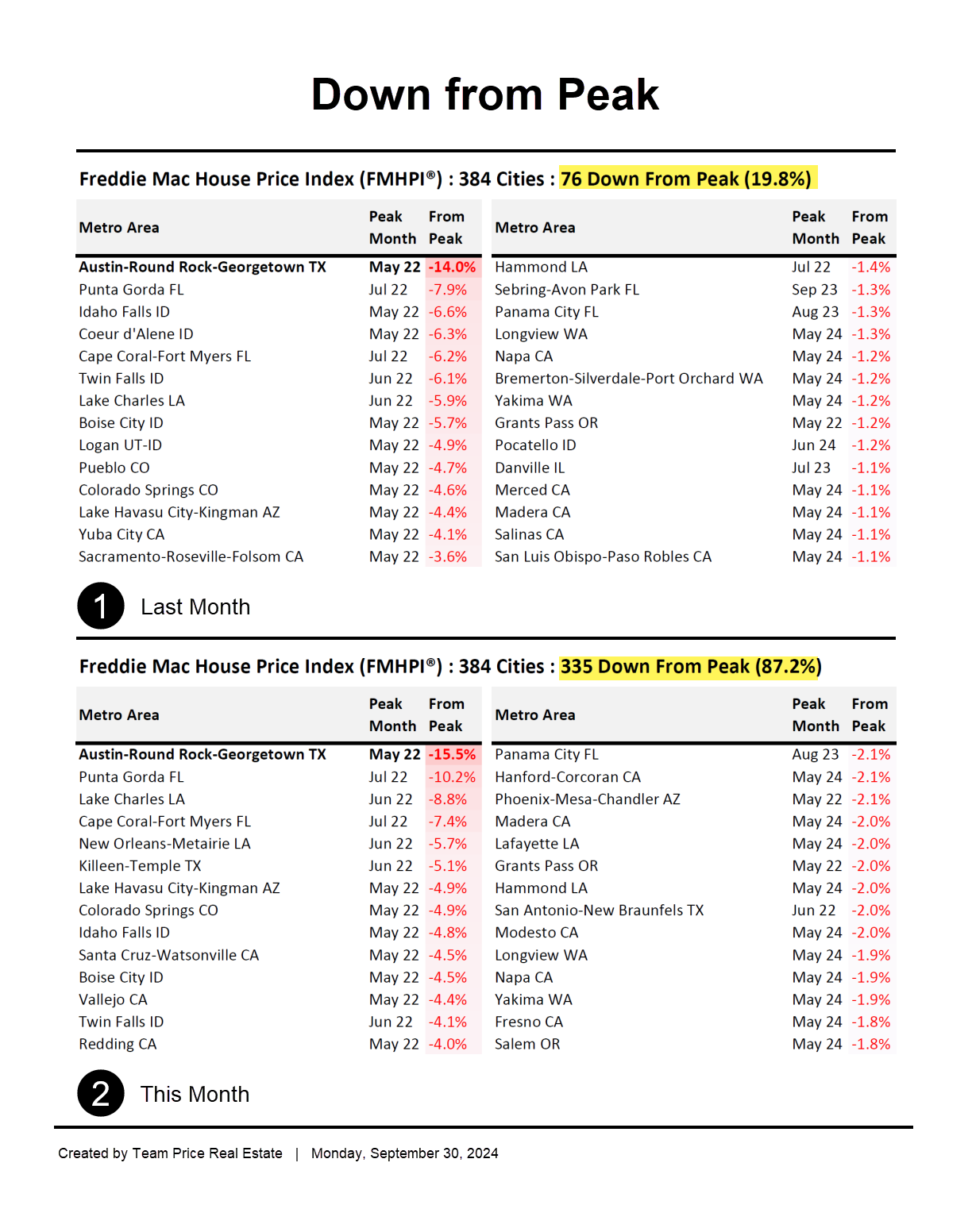 One of the most important insights from the Freddie Mac House Price Index is the "Down from Peak" data. Last month, 76 out of the 384 cities tracked by the FMHPI had experienced a decline from their peak home values. However, in just one month, that number surged to 335 cities—a staggering 87.2% of the tracked markets. This dramatic increase suggests a widespread correction in home prices across the United States. Austin, which saw a significant drop of 15.5% from its peak, may very well be the "canary in the coal mine" for this broader market downturn. As one of the first major cities to experience a sharp price decline, Austin could be signaling what’s to come for other cities. With more markets now following suit, this data reflects a cooling housing market that could become a national trend in the coming months.
