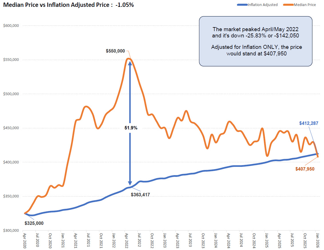Since that peak, the market has undergone a sustained correction. As of January 2026, the median sold price stands at $407,950, while the inflation-adjusted price benchmark sits at $412,287. This means that, when adjusted for inflation, homes are now selling for slightly less than their April 2020 equivalent value. The entire real price premium accumulated during the post-2020 surge has been erased.