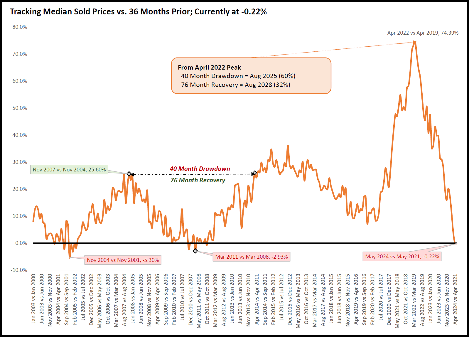 Looking at lagging indicators, the median sold price compared to 36 months prior provides a long-term view of price trends. Historically, the Austin market has seen significant growth, such as the 74.39% increase from April 2019 to April 2022. However, recent data reveals a shift. As of May 2024, the median sold price compared to May 2021 has declined by 0.22%. This marks the first negative change since October 2011, when the median sold price compared to October 2008 was down by 0.78%. This recent decline indicates that the market is experiencing a period of adjustment, with prices leveling off or decreasing after years of growth.