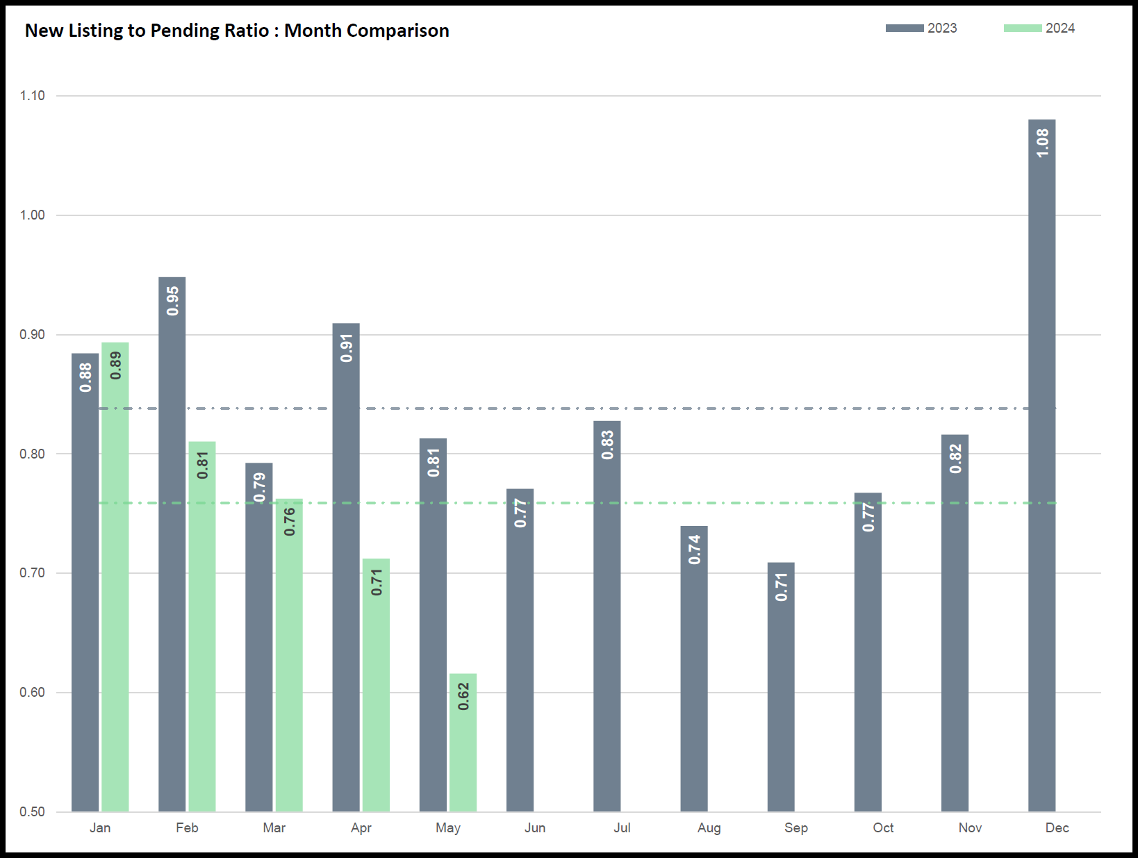 Similarly, the new listing to pending ratio has been decreasing steadily. In February 2024, the ratio was 0.81, meaning that for every new listing, there were 0.81 pending sales. By March 2024, this ratio had dropped to 0.76. The downward trend continued in April 2024, reaching 0.71, and it currently stands at 0.62 in May 2024. This ratio provides insight into the balance between new properties entering the market and those being absorbed through sales. A declining ratio indicates that the rate of new listings is outpacing the rate of pending sales, contributing to increased inventory and potential downward pressure on prices.