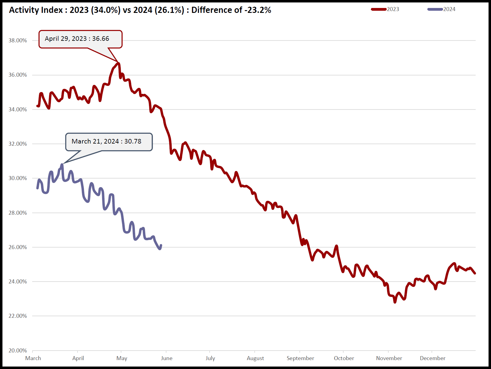 In March 2024, the activity index, which is calculated by dividing the number of pending properties by the total of active and pending properties, peaked at 30.78%. This peak signaled a high level of market activity. However, since the third week of March, this index has been on a downward trend, currently standing at 26.1%. This decline suggests that fewer properties are moving from active to pending status, indicating a slowdown in market activity.