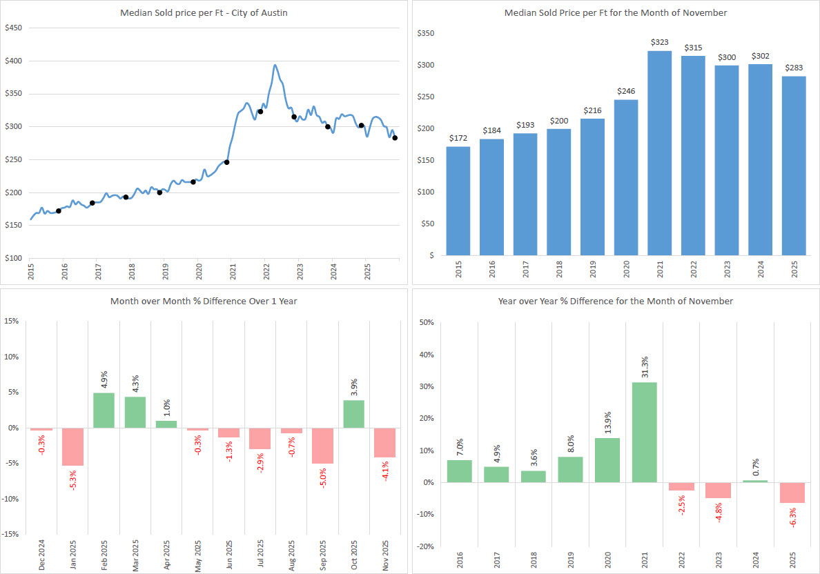Austin home prices are 28 percent below the 2022 peak. The highest recorded median price per square foot was $393 in April 2022, compared to $283 in November 2025. This $110 difference represents the full reversal of the pandemic-era surge. Today’s levels are much closer to late 2020 and early 2021 conditions.