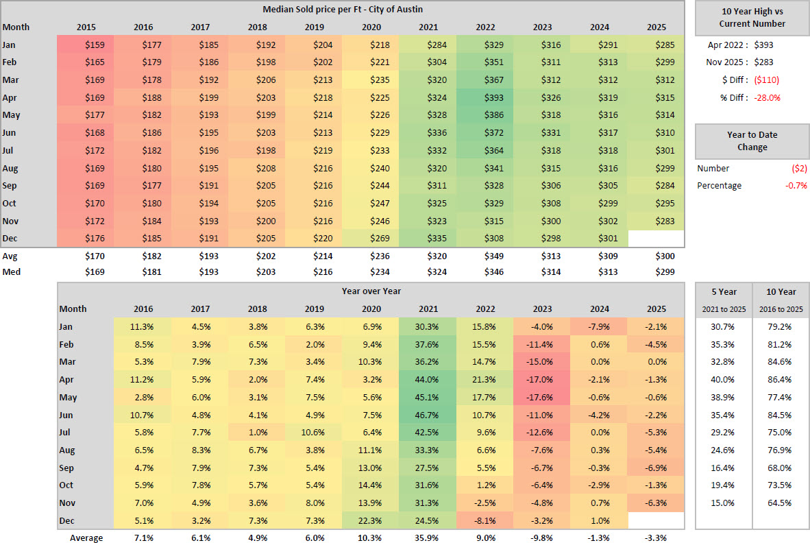 To understand today’s Austin housing conditions, it’s useful to revisit the market’s high-water mark. The 10-year peak landed in April 2022 at a median $393 per square foot. This month remains the ceiling of the Austin property market—a moment defined by extreme demand, historically low mortgage rates, and a supply squeeze that no longer exists. When we compare that peak to November 2025’s $283, Austin real estate is sitting 28 percent below its high. This $110-per-foot decline marks a complete unwinding of the pandemic-era surge and aligns with what we see across the entire price-per-foot timeline from 2015 through 2025.