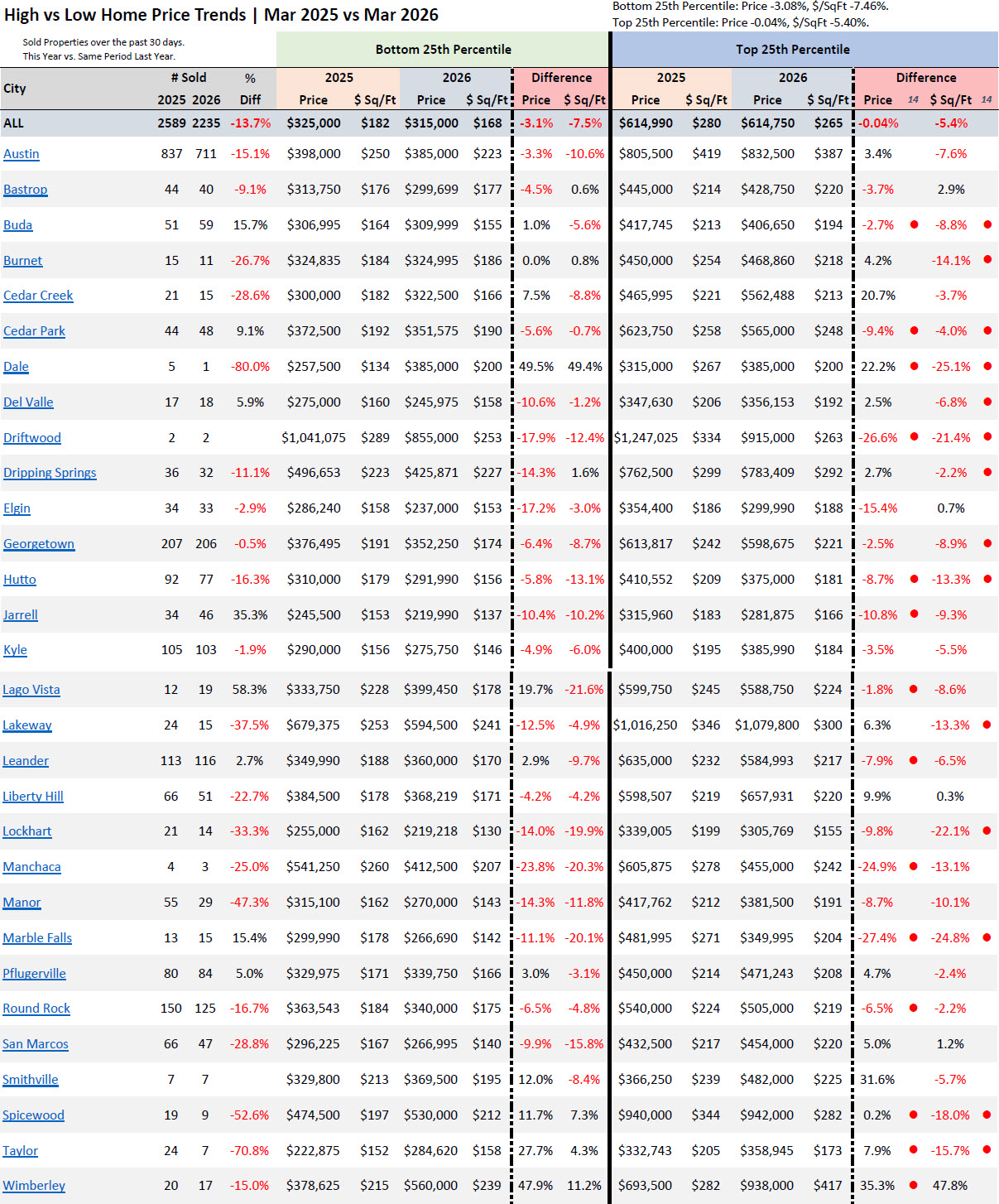 In this dataset, a red dot designation indicates that a city's top 25th percentile is underperforming its bottom 25th percentile — meaning upper-tier homes are declining more sharply than entry-level homes in the same market. This is a reversal of the pattern that defined the Austin real estate market for much of 2024 and early 2025. Red dot cities currently include Cedar Park, Hutto, Buda, Round Rock, Georgetown, Leander, and Marble Falls, among others. This matters because it signals that the correction is no longer concentrated at the affordable end of the market. Sellers of higher-priced homes in these communities are now experiencing more pricing pressure than their entry-level counterparts, which has significant implications for how sellers and real estate professionals should approach pricing strategy in those specific markets.