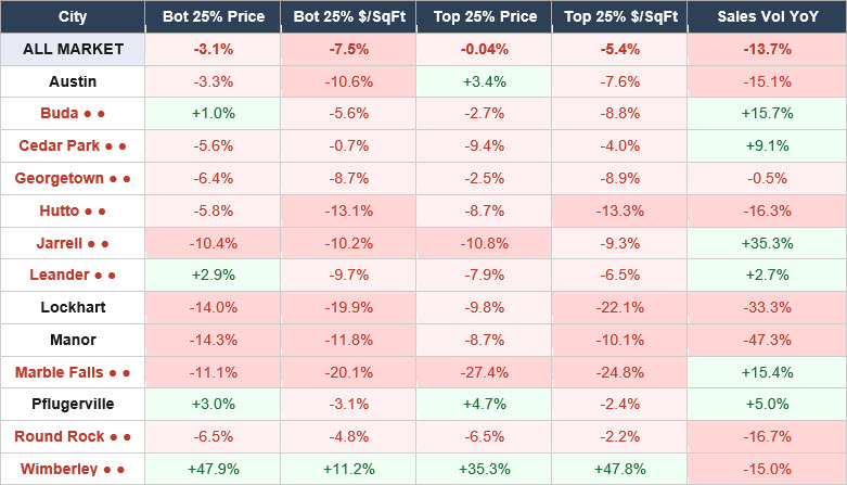 The table below shows year-over-year price change and sales volume for selected cities across the Austin metro. Cities marked with a red dot (●) are those where the top 25th percentile is underperforming the bottom 25th percentile — meaning the expensive tier in that city is falling harder than the affordable tier. Note: cities with fewer than 10 sales (Driftwood, Dale, Manchaca, Smithville) should be interpreted with caution due to small sample sizes.