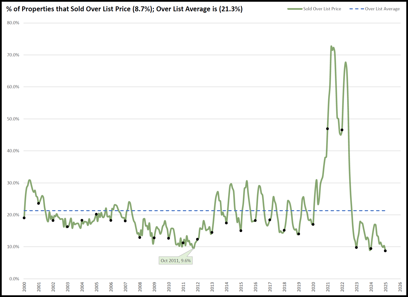 The years 2023 and 2024 have been characterized by market stabilization. In 2023, the percentage of homes sold over the list price averaged 13.7%, with a high of 17.9% in April. This trend continued into 2024, averaging 12.6%, with a peak of 17.0% in April. Early data for 2025 suggests further cooling, with a consistent 8.7% rate across the first few months.