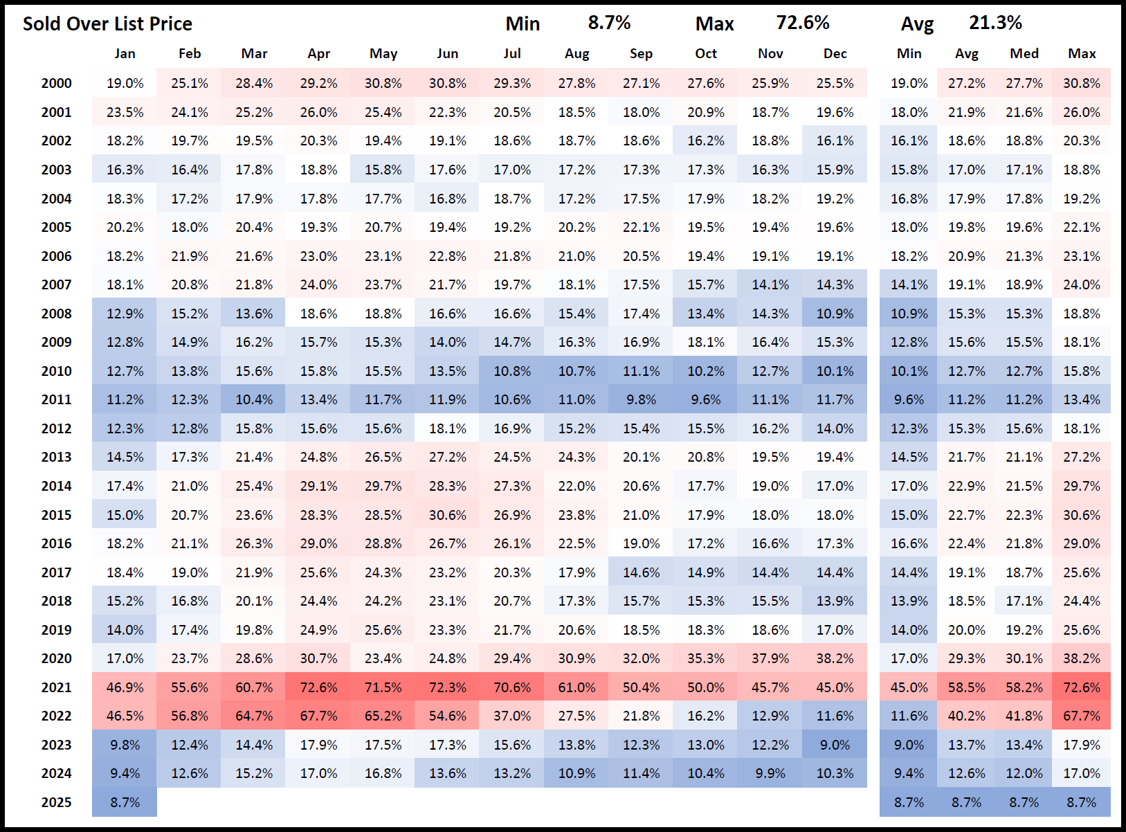 The recovery phase from 2011 to 2019 saw a gradual increase in competitiveness. In 2012, the market began to regain strength, with sold-over-list percentages rising back into the 20% range. By 2019, the market had stabilized with an average of 20.0% and a peak of 25.6% in May, signaling a healthy demand but not an overheated market.