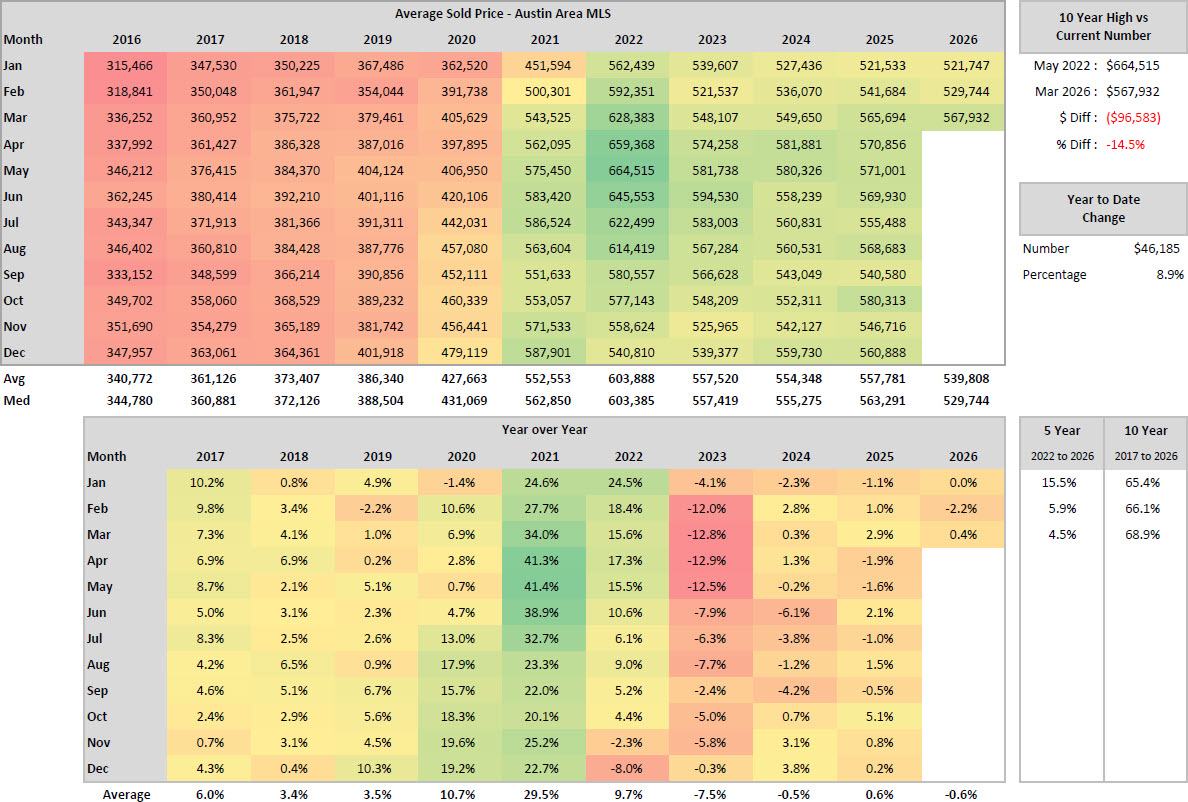 As of March 2026, the average sold price in the Austin Area MLS is $567,932. This figure represents the entire Austin-area multiple listing service and reflects all residential property types tracked in the MLS. The current average is 0.4% above March 2025's $565,694, marking the third consecutive year of year-over-year March price gains. It remains 14.5% below the all-time peak of $664,515 recorded in May 2022.