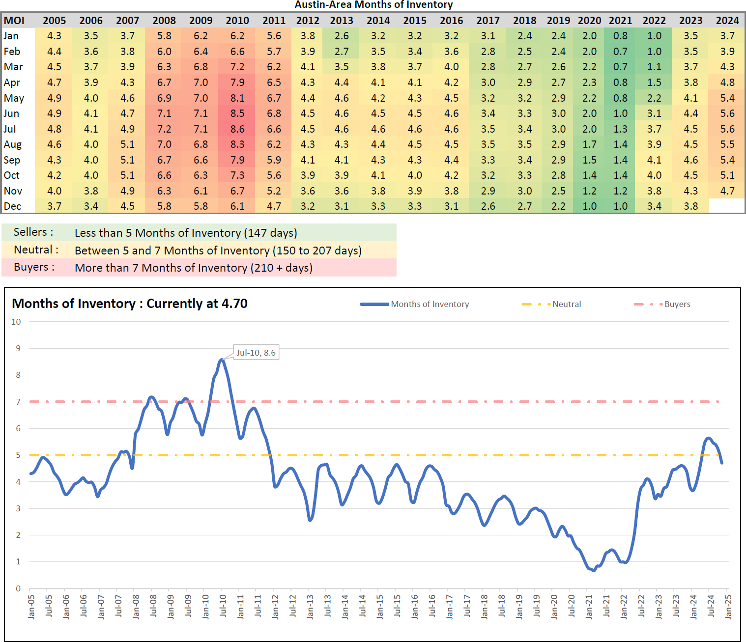 Historically, Austin's MOI has varied in response to economic conditions and market dynamics. Between 2005 and 2007, the MOI averaged around 4 to 5 months, indicating a balanced to seller's market. For instance, in January 2005, the MOI was 4.3 months, suggesting a seller's market. This trend continued through 2007, with January recording 3.7 months of inventory.