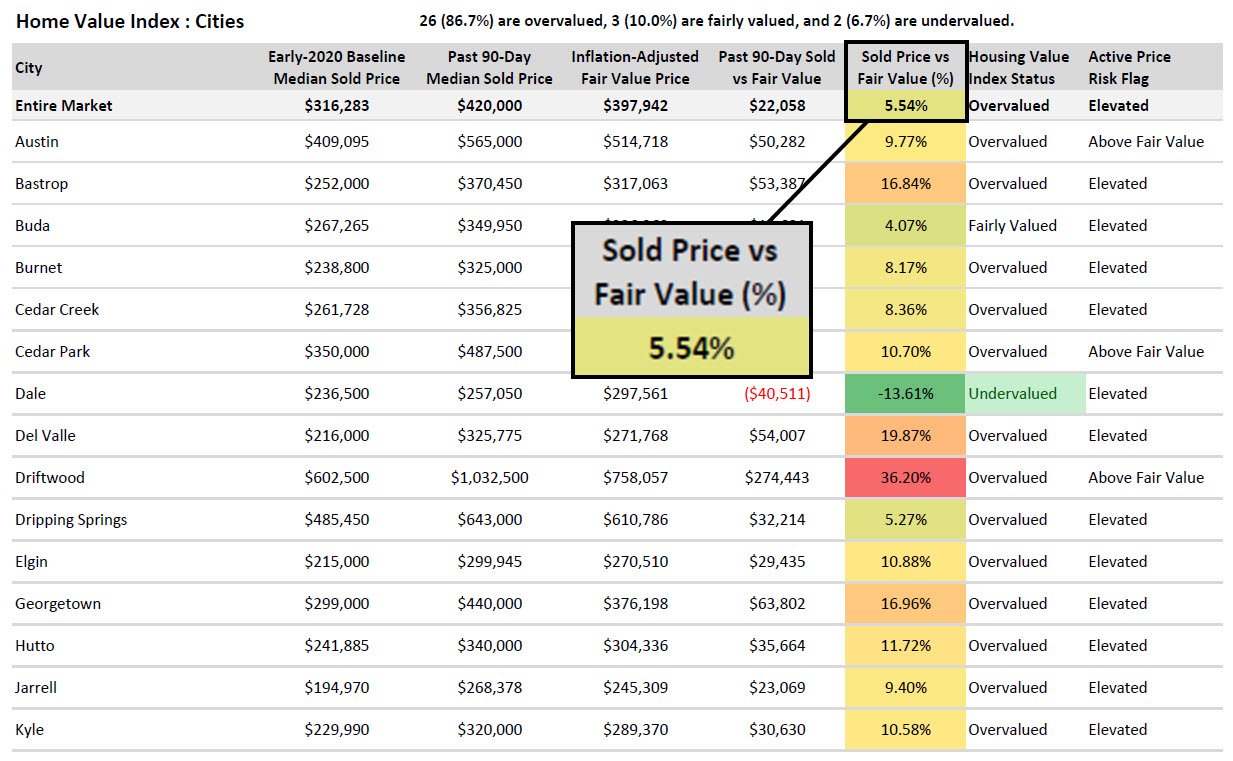 What makes the current Austin housing market especially important to analyze is the dispersion beneath the surface. City-wide and metro-wide averages conceal meaningful differences across submarkets. Some cities remain materially overvalued relative to inflation-adjusted benchmarks, while others have already corrected back to fair value or below. This divergence is now more pronounced than at any point earlier in the cycle.