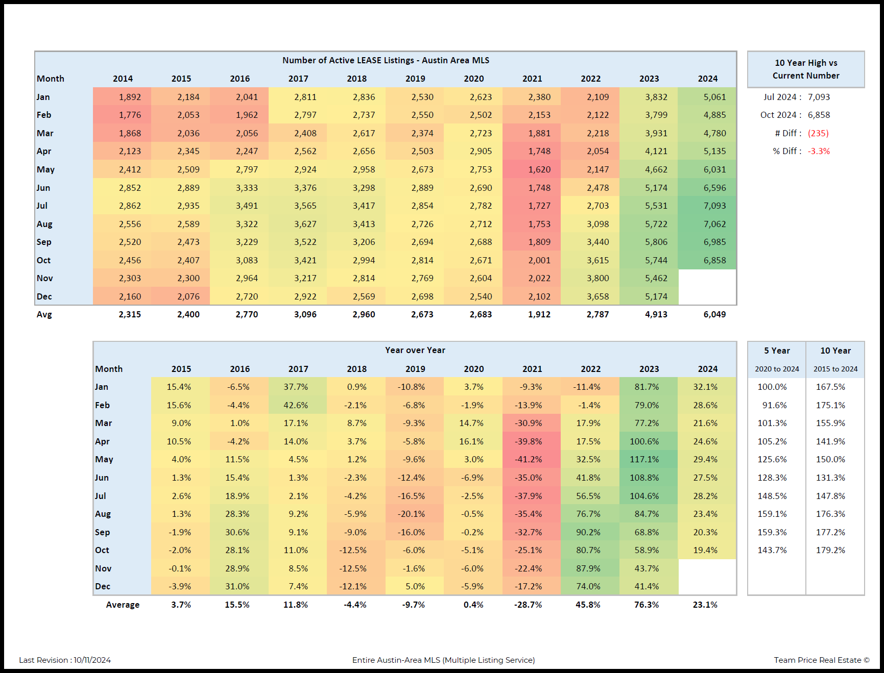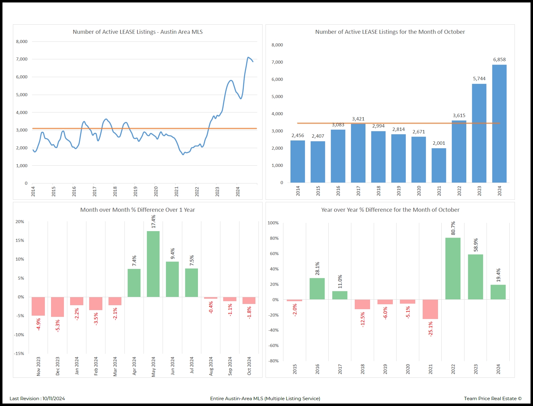 The Austin Area MLS has seen a remarkable growth in active lease listings over the past decade, with a particularly significant surge from 2021 to 2024. In October 2024, the number of active lease listings reached 6,858, a considerable increase from the 2,771 listings recorded in October 2021. This represents a 147% increase over three years, illustrating the growing rental market in Austin. This substantial growth reflects the area’s evolving real estate dynamics and highlights a shift toward leasing, as rising mortgage rates and affordability challenges impact the purchase market.