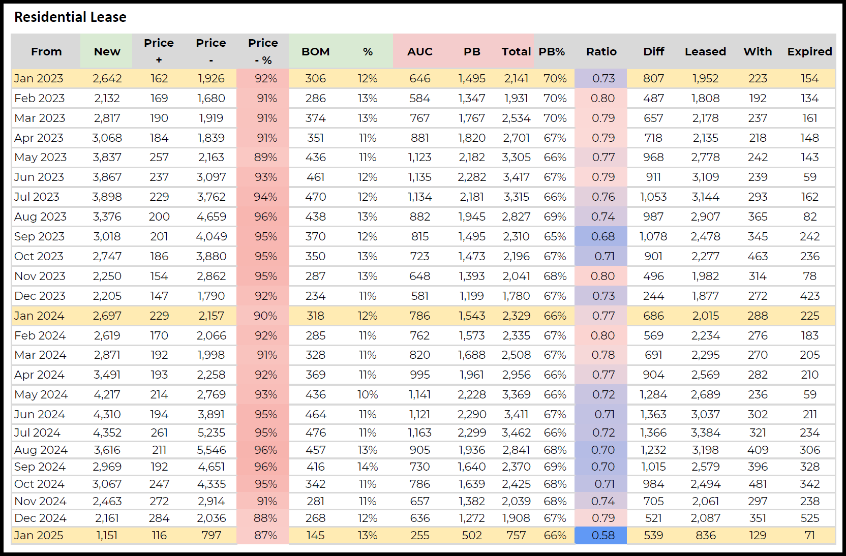 Pending transactions followed a similar pattern. In January 2023, pending leases totaled 1,926, growing to 2,157 in January 2024. For January 2025, pending leases were 797 within the first 13 days. Projected for the entire month, this figure could reach approximately 1,901, slightly below January 2024 but still reflecting a healthy level of tenant demand.