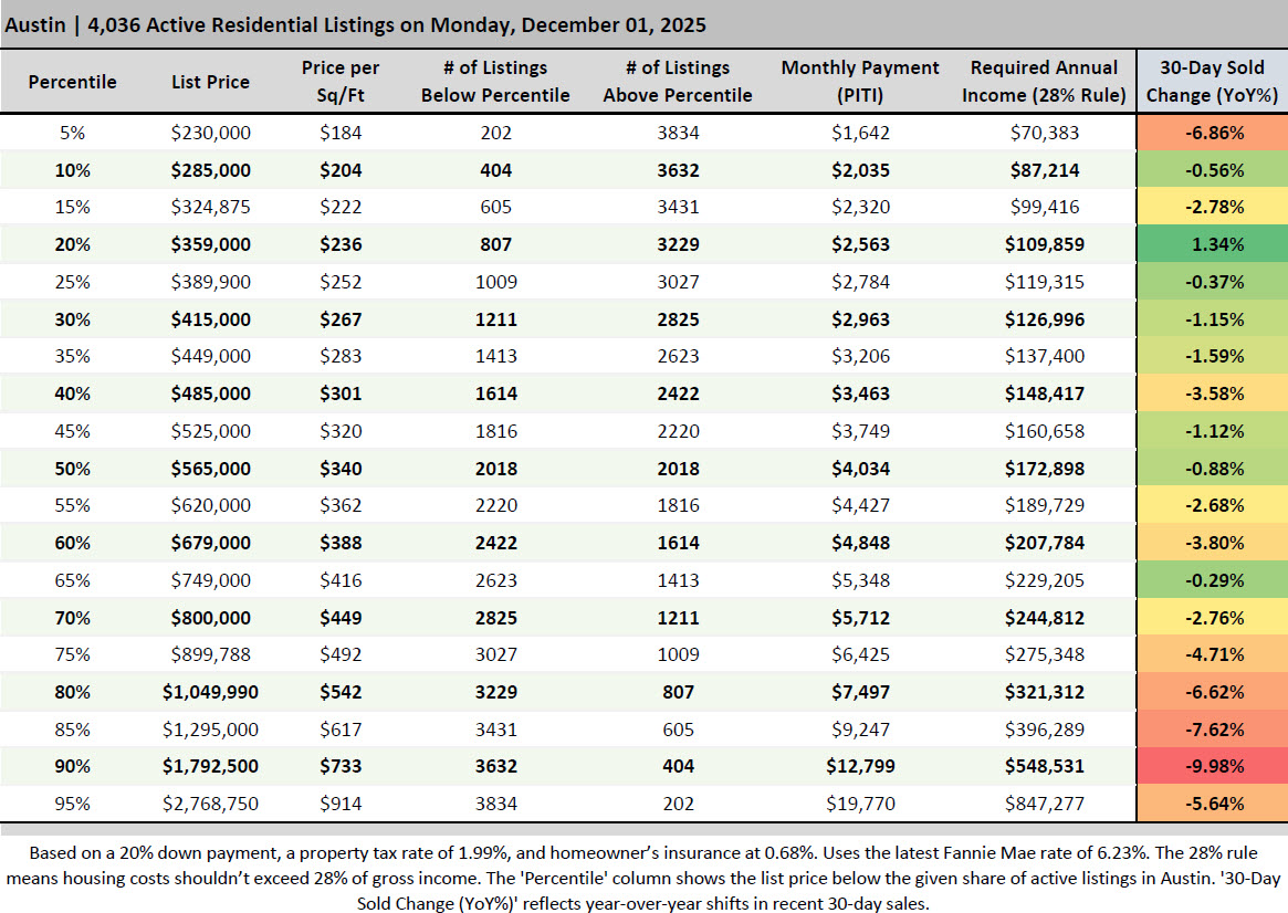 Yes. While Austin’s overall market shows moderation, the most pronounced declines are occurring in the 80th to 90th percentile ranges. The -6.62 percent and -9.98 percent year-over-year declines demonstrate that the luxury sector is softening more rapidly than mid-tier segments, which tend to benefit from broader buyer pools and stronger absorption.