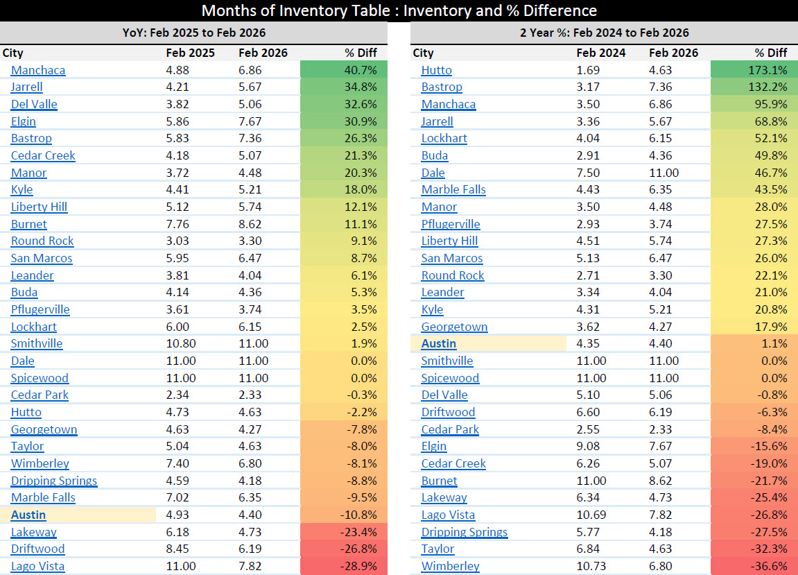 For the City of Austin, months of inventory are now down 10.8% year over year, moving from 4.93 months in Feb 2025 to 4.40 months in Feb 2026. That is a meaningful contraction in supply on a YoY basis and signals that Austin is tightening relative to last year, not loosening.