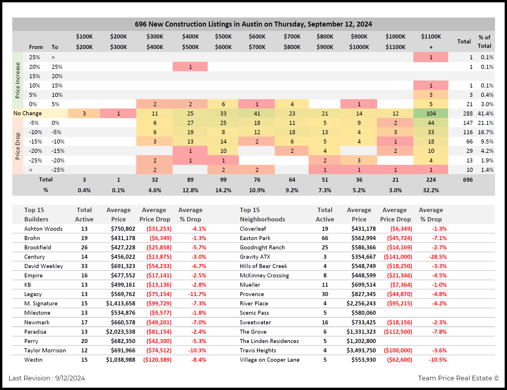 As of September 12, 2024, the Austin real estate market features 696 new construction listings, reflecting a notable trend of price adjustments across a variety of neighborhoods and builders. With Austin continuing to be a hotspot for both buyers and developers, tracking price movements in the new construction sector offers critical insights into the current market dynamics.