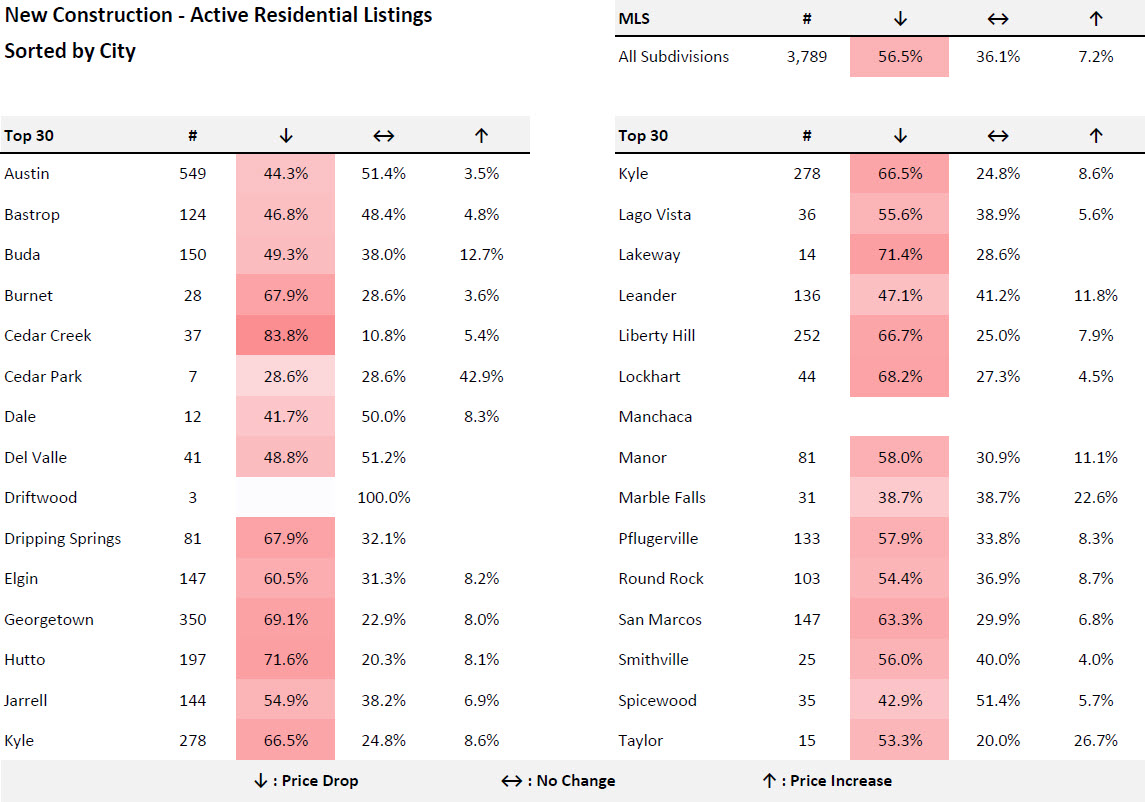 Across all 3,789 new construction listings in the Austin MLS, 56.5% have had price reductions, 36.1% are holding firm, and only 7.2% have seen price increases. That means the clear majority of builders metro-wide are in price-reduction mode. The variation by builder is significant and worth understanding for any buyer comparing options.