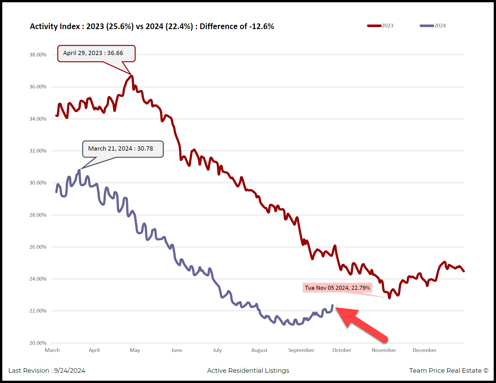 Currently, the Activity Index for 2024 sits at 22.4%, marking a notable difference of -12.6% compared to the 25.6% figure from 2023. Despite this decline from the previous year, recent data shows that the market may be turning a corner. Pending sales, for example, are now at 4,247, their highest level since August 1, 2024. Meanwhile, active listings have decreased to 14,753, down from a peak of 15,503 on July 15, 2024. This drop of 750 active listings is a strong indicator of tightening inventory, a trend that often accompanies increased buyer interest.