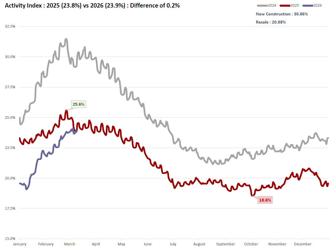 At 23.9% today versus 23.8% a year ago, the current reading represents a difference of just 0.2 percentage points year over year. That near-parity with 2025 is actually quite significant given where this metric stood six months ago. Through the back half of 2025, the Activity Index struggled, touching a low of 18.6% in late October before beginning a slow recovery. The fact that 2026 has already clawed back to parity with 2025 — and has done so within the first ten weeks of the year — reflects a meaningfully more active austin housing market than most forecasters anticipated heading into the new year.