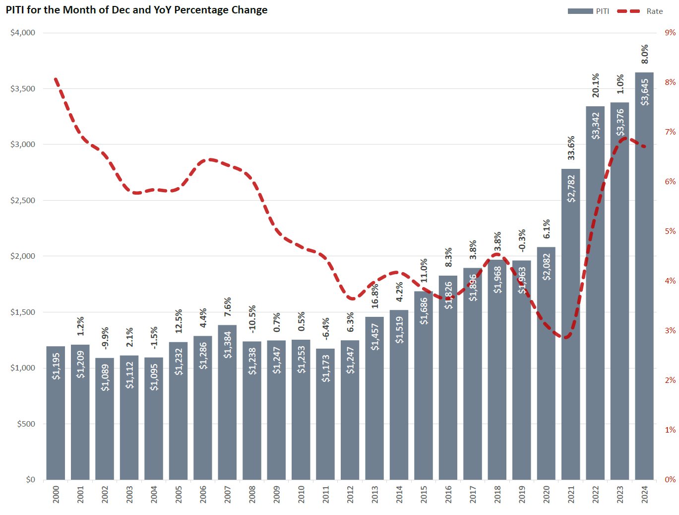 The trend continued into 2023 and 2024, with monthly PITI in Austin remaining high. In 2023, the average mortgage payment was $3,443, and in 2024, it hovered around $3,381. Interest rates stayed elevated, with the median rate around 4.54% in December 2024. Although these figures represent a slight improvement from the 2022 peak, they still indicate significant affordability challenges compared to historical levels in Austin.