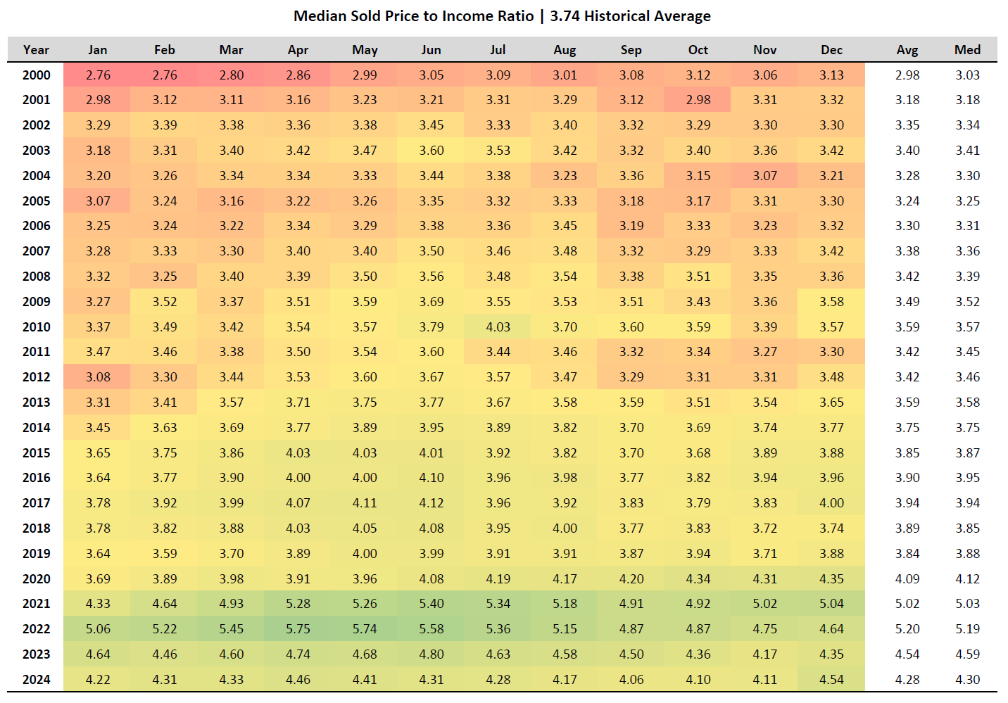 Over the past 24 years, the median sold price-to-income ratio in Austin has also increased. In 2000, the ratio was 2.76, meaning a home’s median price was 2.76 times the median household income. By April 2022, this ratio peaked at 5.75, highlighting the growing gap between Austin home prices and incomes. As of December 2024, the ratio stands at 4.54, above the historical average of 3.74. This indicates that despite recent improvements, Austin home prices remain disproportionately high compared to household incomes.