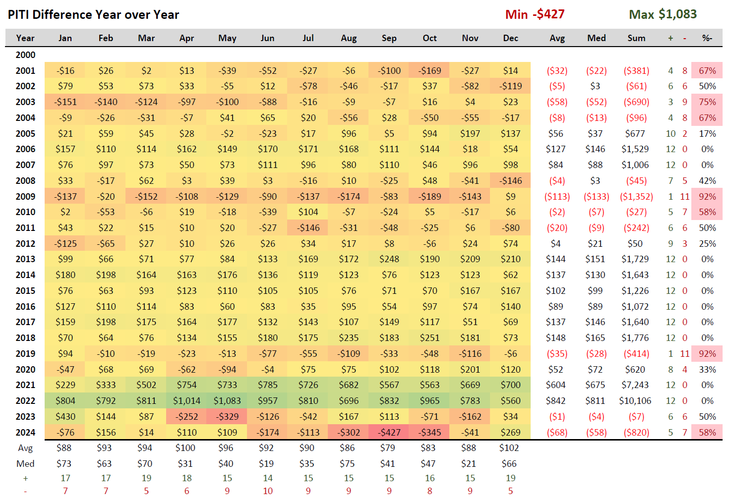 Year-over-year changes in PITI show how volatile the Austin housing market has become. Between 2021 and 2022, monthly mortgage payments increased by over $800. In contrast, the period from 2009 to 2010 saw minimal changes, reflecting the stability after the housing crash. These fluctuations are largely driven by changes in interest rates and Austin home prices. For example, in 2021, interest rates climbed from 4.33% in January to 5.40% by June, contributing to the sharp rise in PITI.