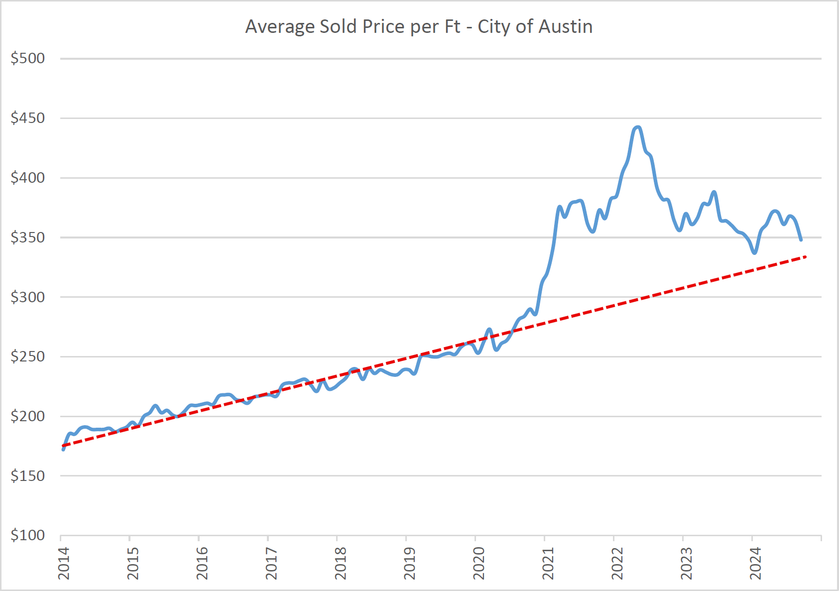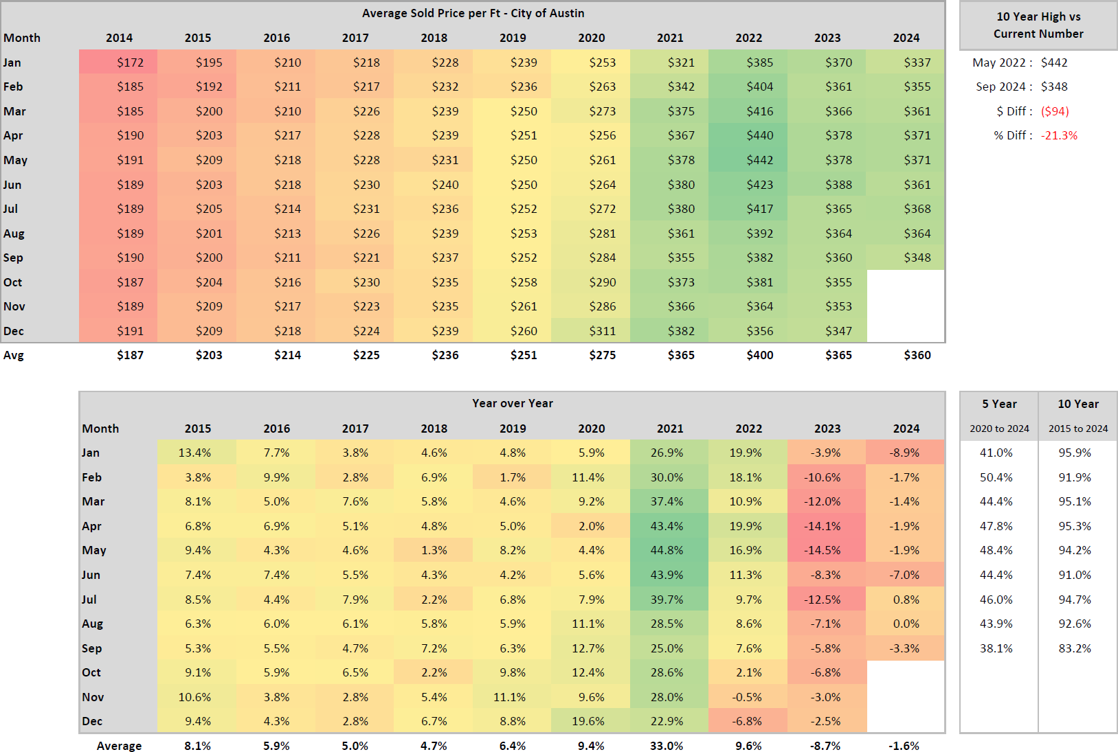 September 26, 2024 : The City of Austin real estate market has experienced significant changes over the past decade, with a notable rise and subsequent correction in the average sold price per square foot. From 2014 to 2024, the price of homes in Austin has shown both steady growth and moments of rapid appreciation, followed by a marked decline in recent years.