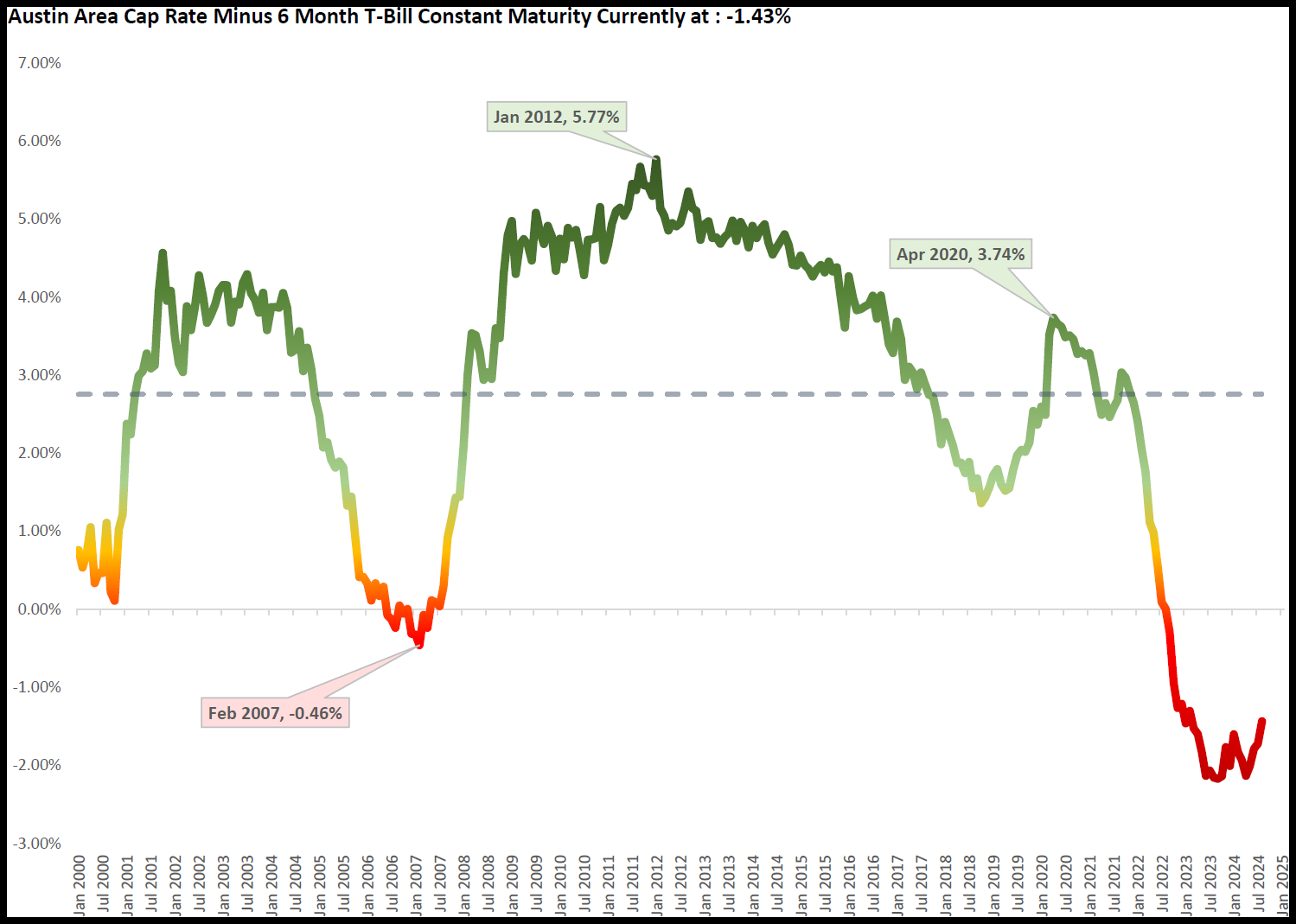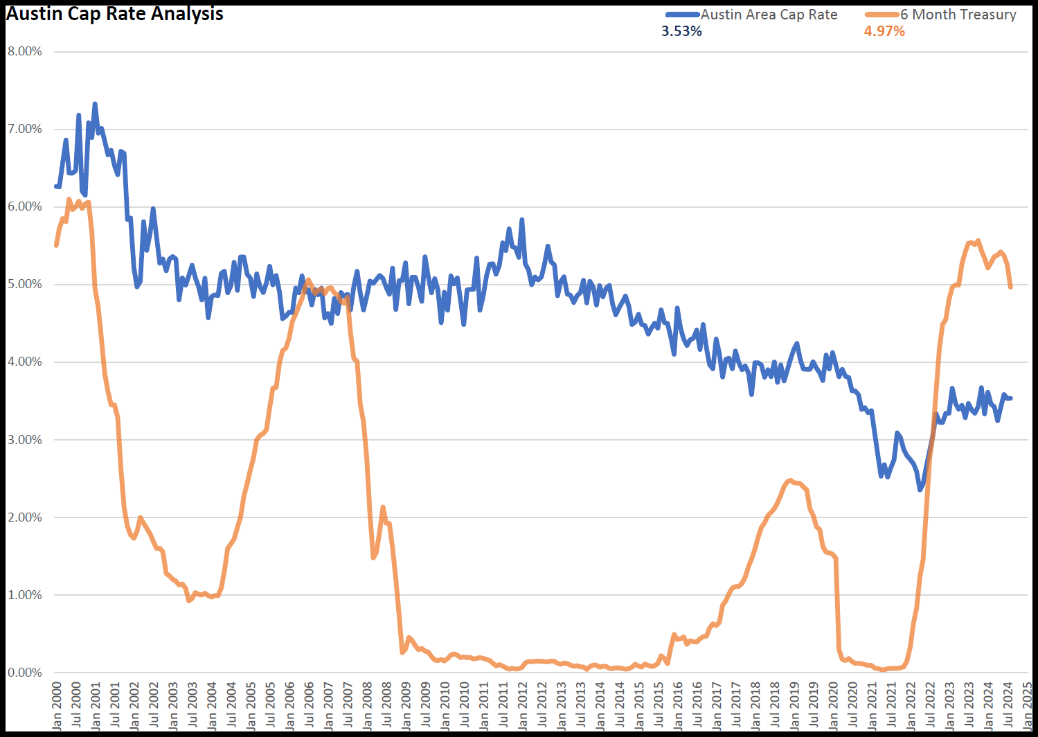 Another important aspect of the Austin real estate market is the relationship between cap rates and the 6-Month Treasury Bill yield. The 6-Month Treasury Bill yield serves as a benchmark for low-risk investments, often used by investors to compare the returns offered by real estate. Over the analyzed period, the Austin area cap rate remained consistently lower than the 6-Month Treasury Bill yield. In January 2023, for example, the cap rate was 3.34%, while the 6-Month Treasury Bill yield was significantly higher at 4.80%. This gap widened further, reaching -2.17% in September 2023. While real estate investments in Austin have seen modest cap rate improvements, the returns compared to low-risk government securities still lag.