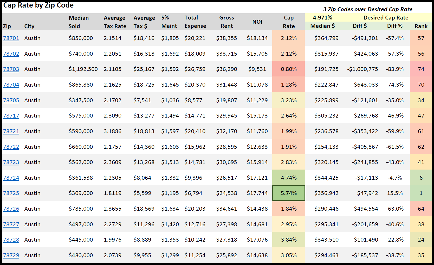 The cap rate data also varies significantly by zip code within Austin. For example, in the 78725 zip code, the cap rate reached a high of 5.74%, making it one of the most attractive areas for real estate investment based on yield. On the other hand, zip codes such as 78703 and 78746 showed much lower cap rates, at 0.80% and 1.30%, respectively. These differences highlight the importance of localized market analysis when considering real estate investments in Austin.