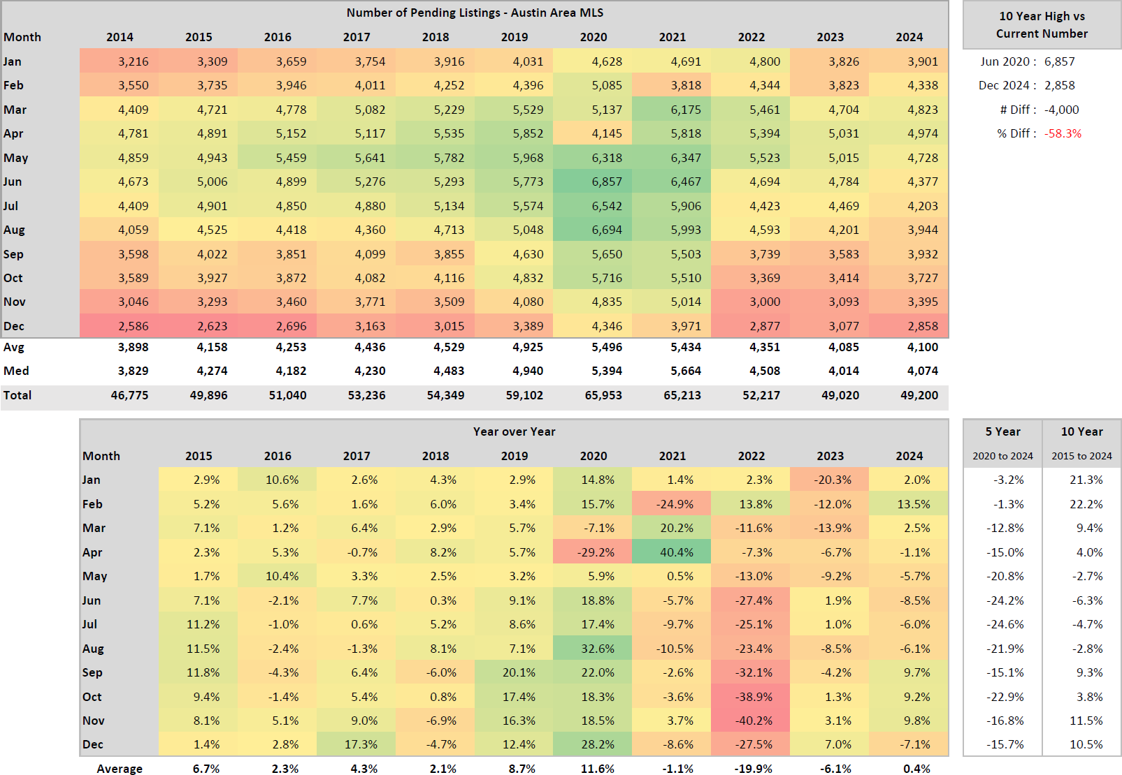Analyzing long-term trends provides additional context to these year-over-year changes. Over the past decade, the total number of pending listings in the Austin Area MLS grew steadily, rising from 46,775 in 2014 to 49,200 in 2024. This gradual increase underscores the region’s sustained demand for housing, driven by population growth and a strong local economy. However, the 5-year average (2020–2024) highlights the volatility introduced by external factors such as the COVID-19 pandemic, fluctuating interest rates, and economic uncertainties.