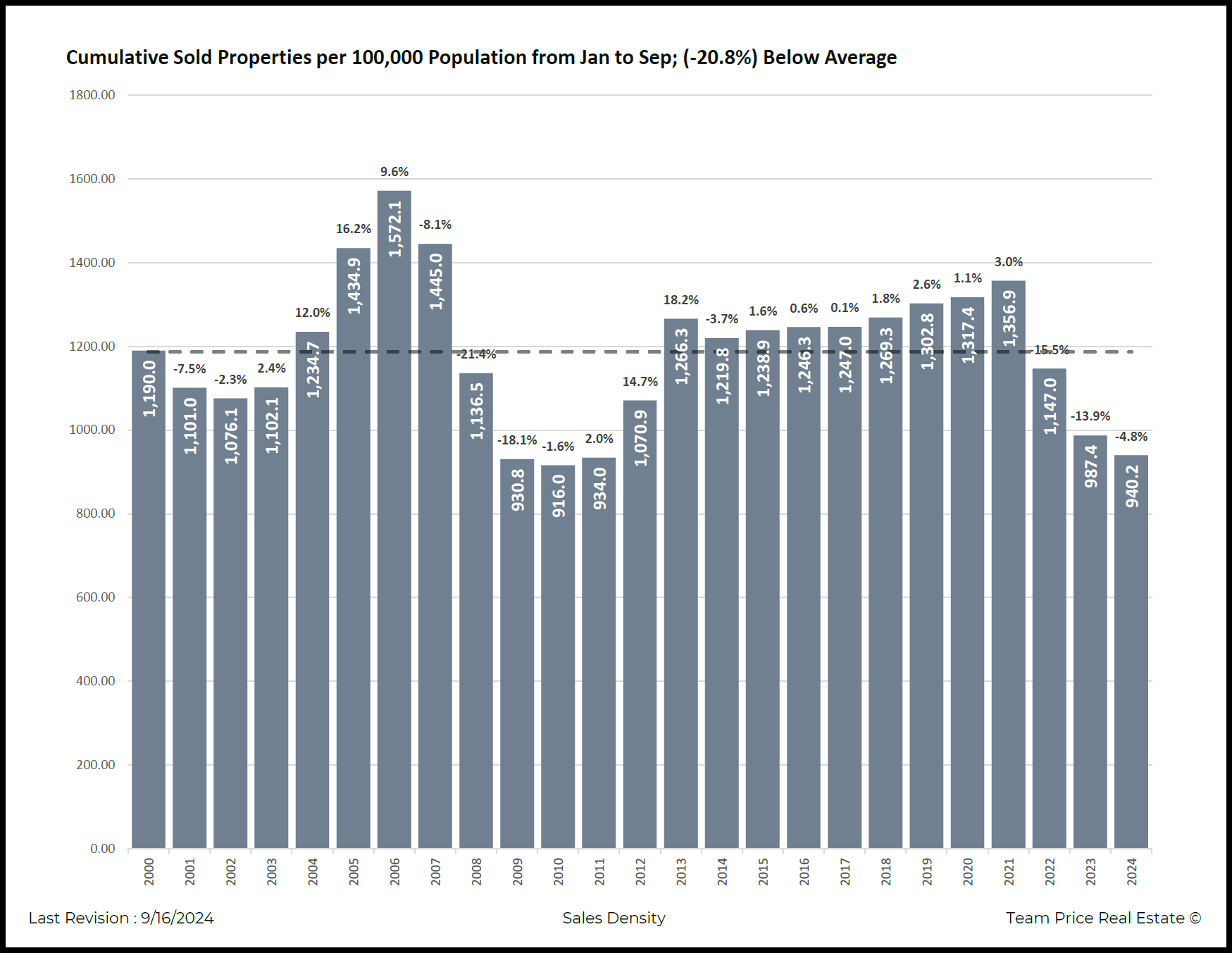 September 16, 2024 : The Austin real estate market, spanning six counties—Travis, Williamson, Bastrop, Hays, Caldwell, and Burnet—has experienced a noticeable slowdown in 2024. From January to September, the cumulative number of sold properties per 100,000 population is down by 20.8% compared to historical averages. This significant decline points to a cooling market, with fewer transactions taking place despite the area's consistent population growth.
