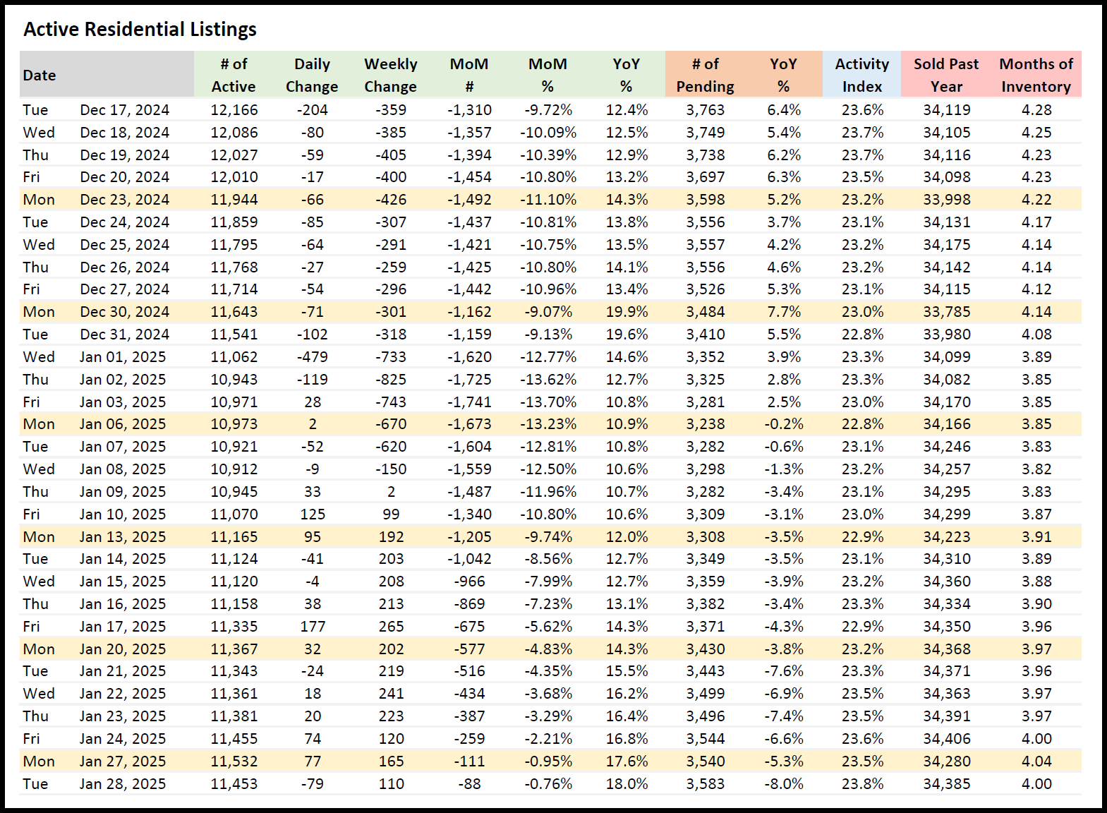 As of January 28, 2025, the Austin real estate market offers valuable insights into current trends and shifts in residential listings. With 11,453 active residential properties available, the market has seen an 18% year-over-year increase compared to 2024. This significant growth reflects changes in both new construction and resale inventory, with new construction comprising 33.5% of active listings and resale properties accounting for 66.5%. These figures suggest a dynamic market environment with opportunities for buyers and sellers alike.