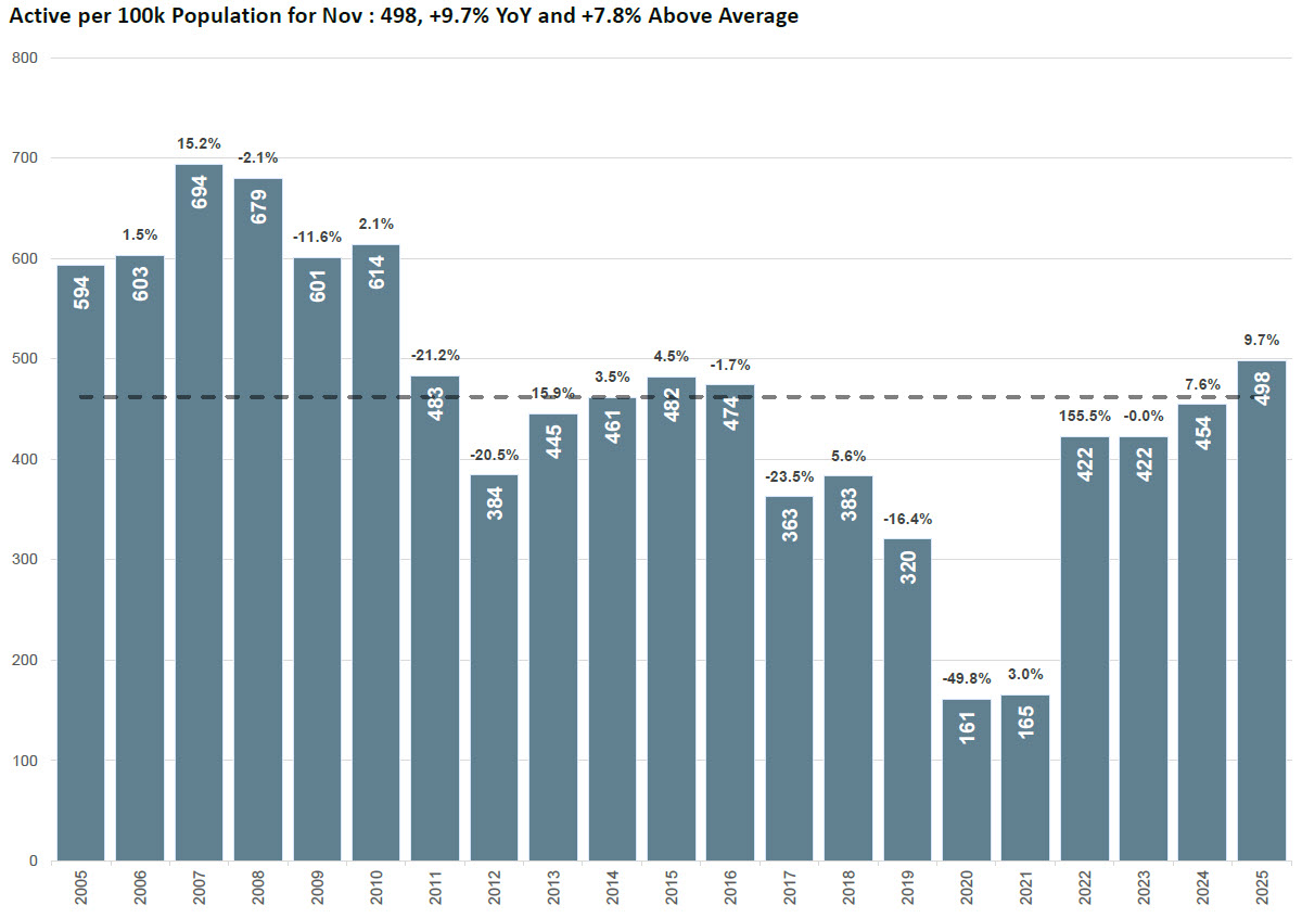 Active housing inventory per capita has returned to levels not seen in more than a decade, signaling a pivotal moment for the Austin real estate market. With 498 active listings per 100,000 residents this November, up 9.7% year-over-year and 7.8% above the long-term average, the data suggests that supply is now growing faster than population-adjusted demand. This is the highest per-capita inventory since 2010, just before the market transitioned into a nine-year contraction. Today’s numbers indicate that Austin is firmly in the oversupply phase of its current market cycle, with stabilization at lower pricing levels occurring but no clear evidence yet of pressure relief from demand-side forces.
