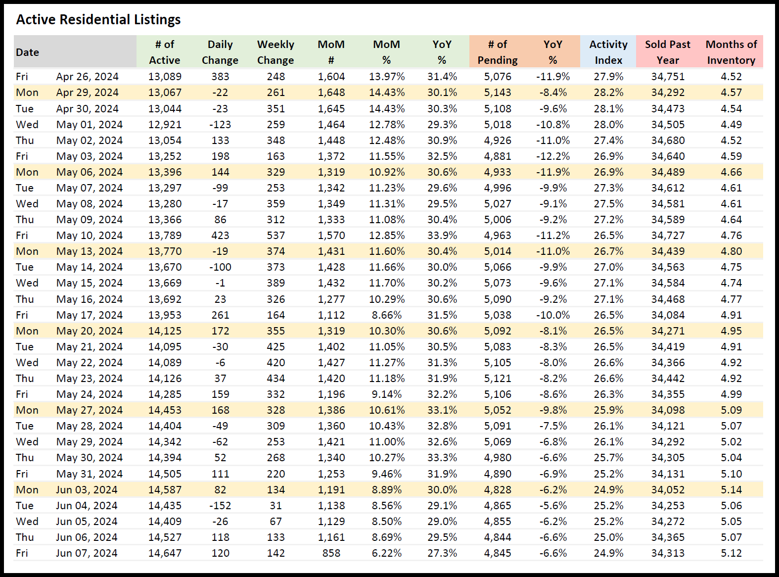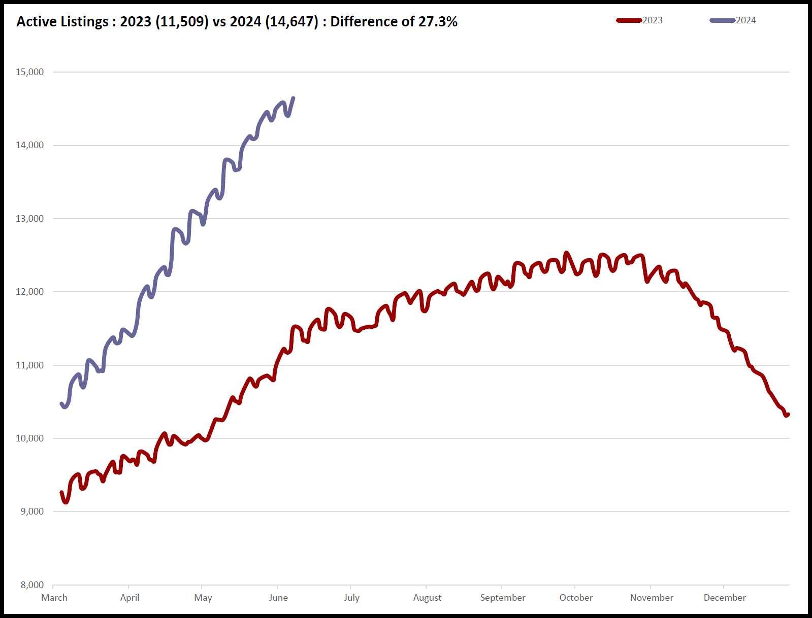 The data from April 26, 2024, to June 7, 2024, reveals a consistent upward trend in active listings. Starting with 13,089 active listings on April 26, the market saw fluctuations with daily changes ranging from notable increases, such as 423 new listings on May 10, to decreases, like the drop of 152 listings on June 4. Weekly changes also varied, reflecting periods of heightened listing activity.
